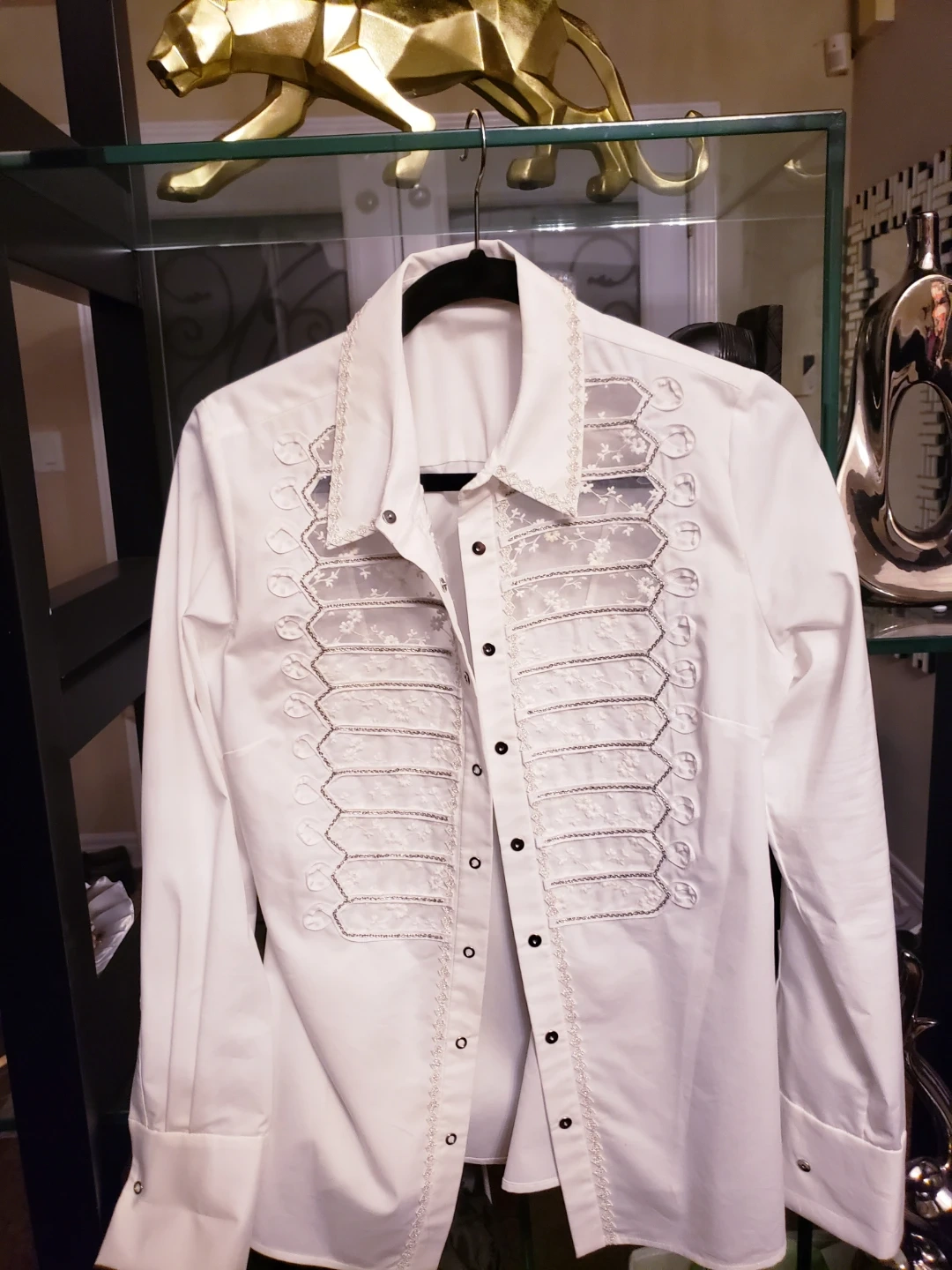21Check out this eye-catching white dress shirt! It features a unique design with decorative detailing on the front. Perfect for adding a touch of flair to your wardrobe.