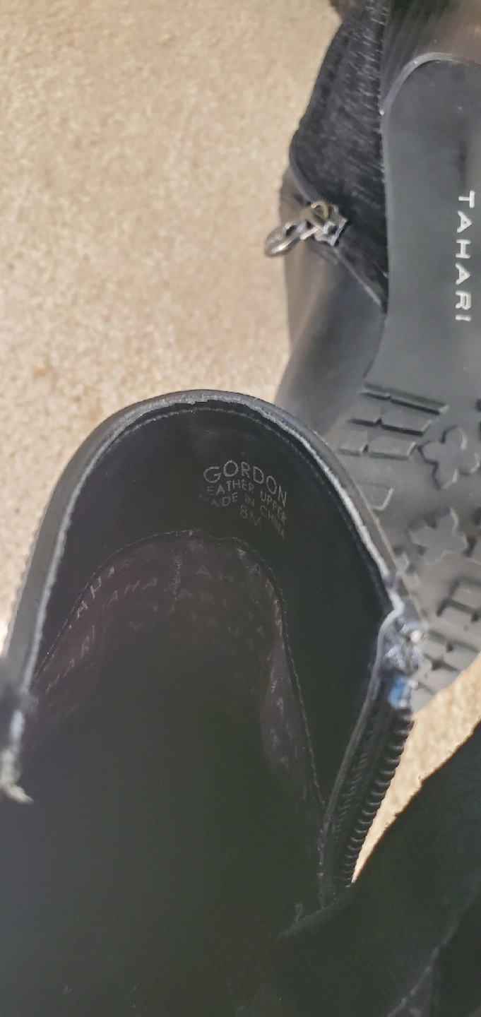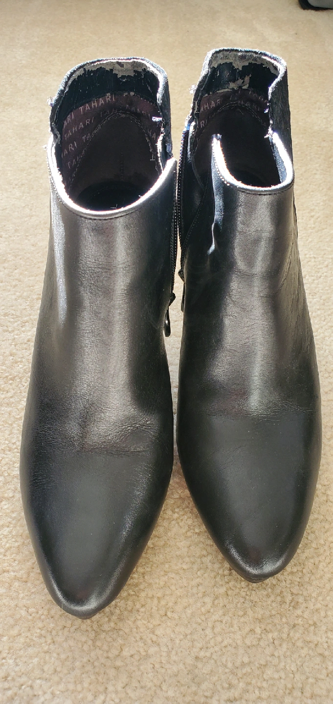 Selling a pair of Tahari "Gordon" booties in size 8M. These are two tone black leather and suade with a zipper closure. These are very comfortable with a sensible heel. They show some signs of wear on the inside (see 2nd pic) but the soles are still in great condition!
