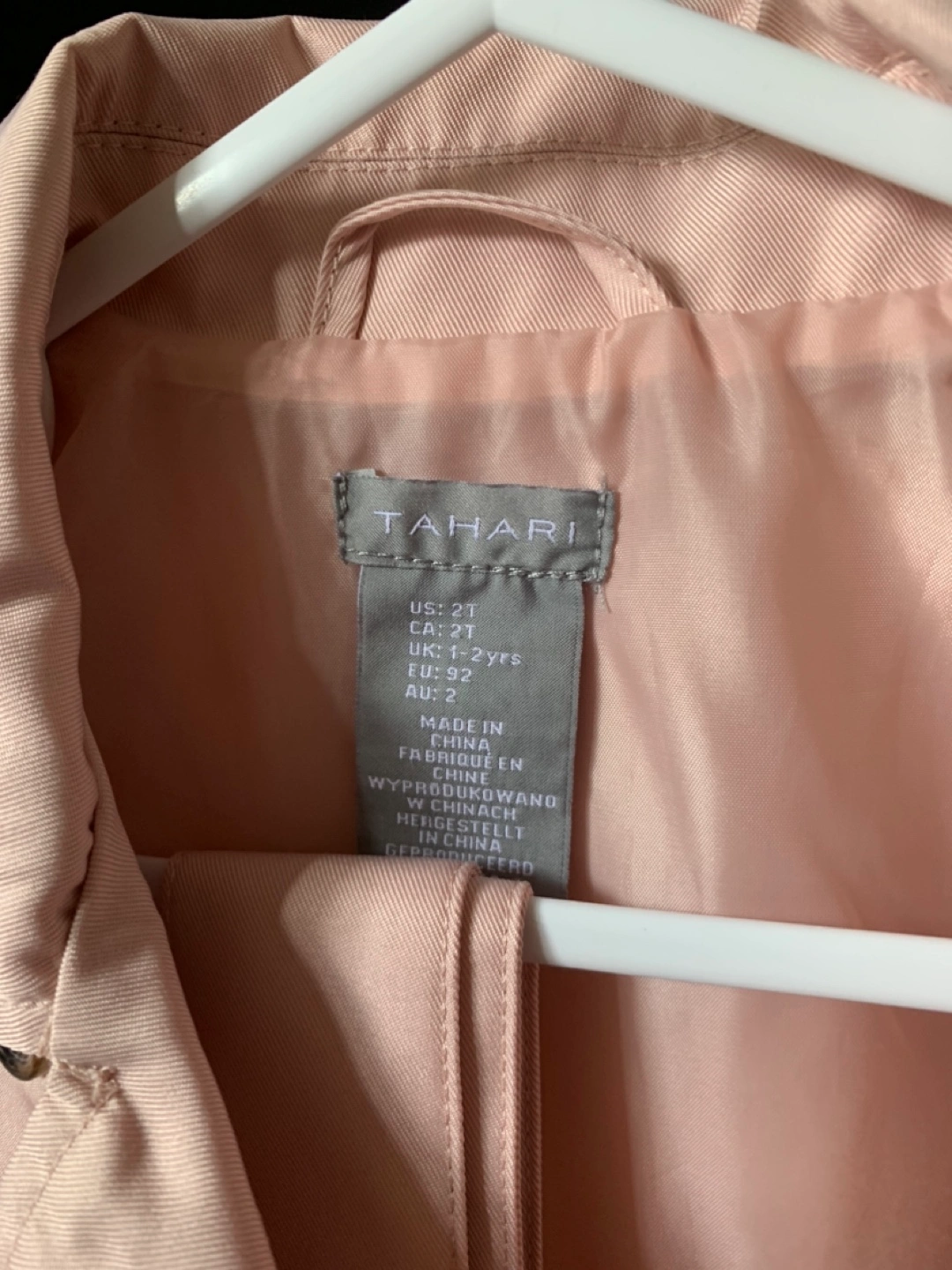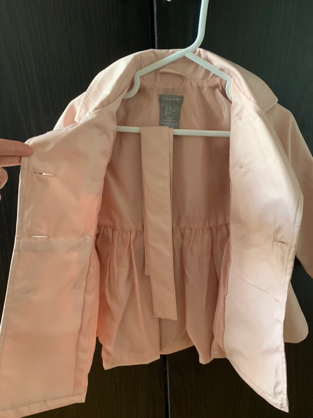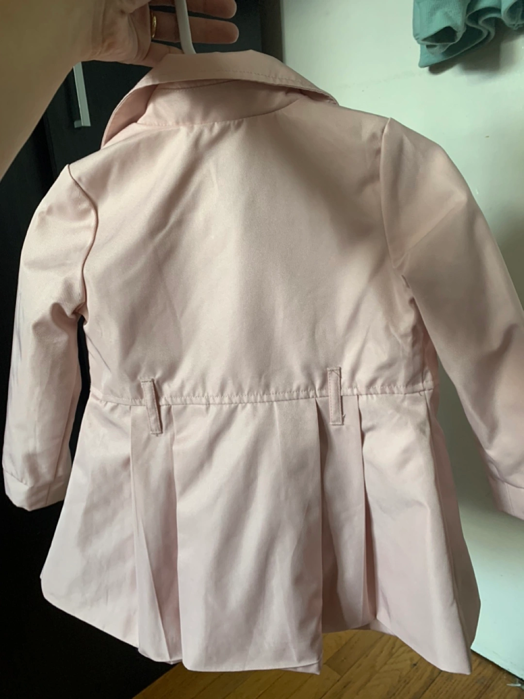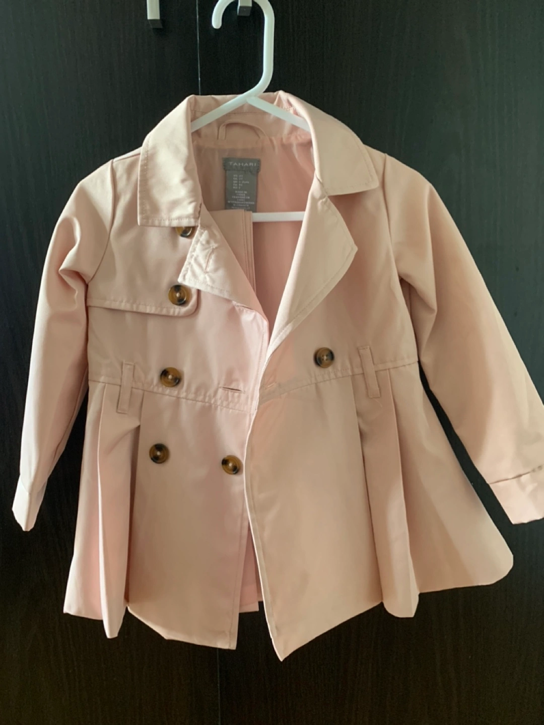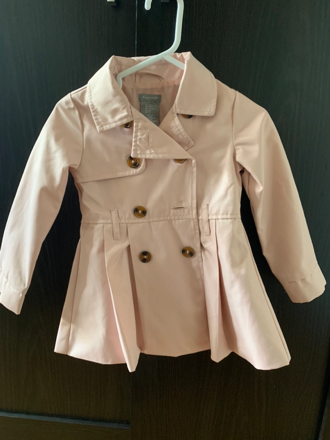 54Adorable pink trench coat. Double-breasted style. Pleated detail at the waist. Size 2T. Great for spring or fall. Never been used!