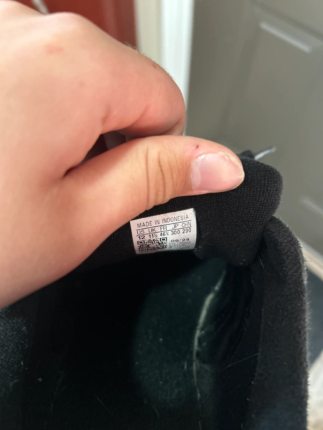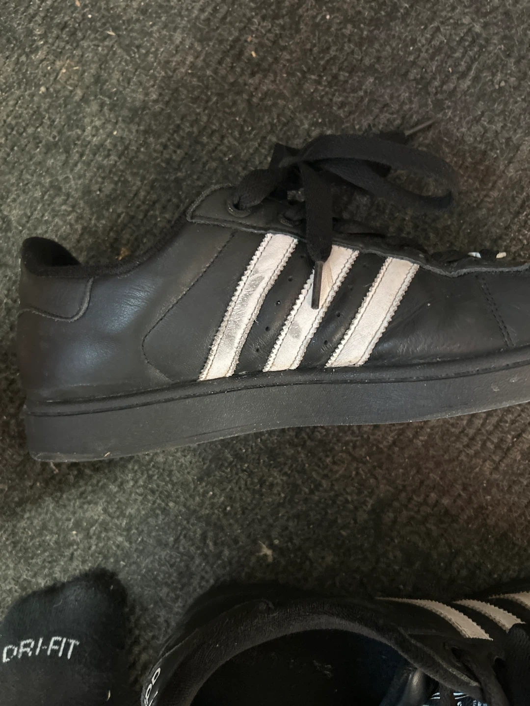 These are classic black Adidas Superstar sneakers. They feature the iconic three stripes and shell toe design. Made in Indonesia. Size 12 (US Men's).