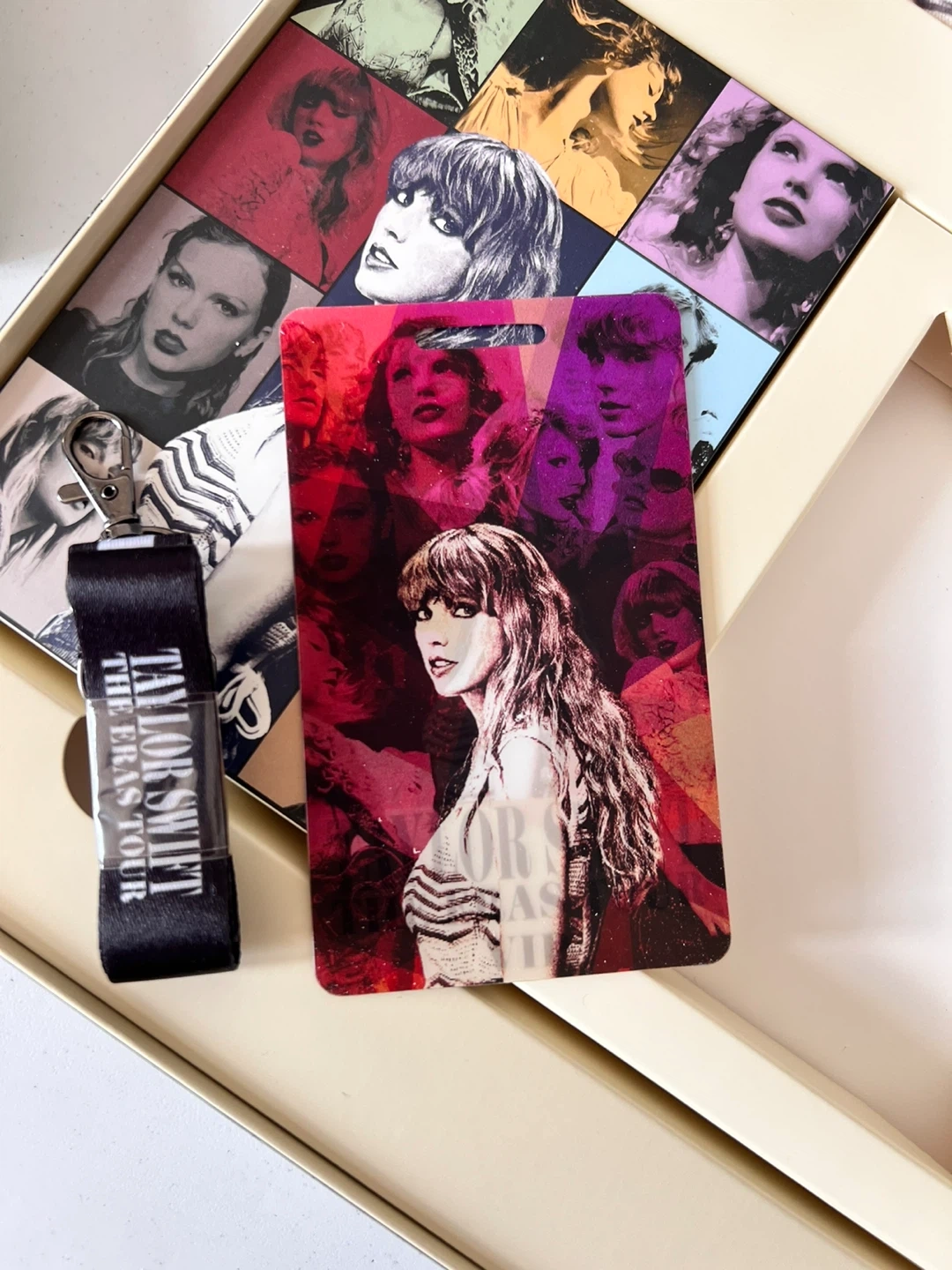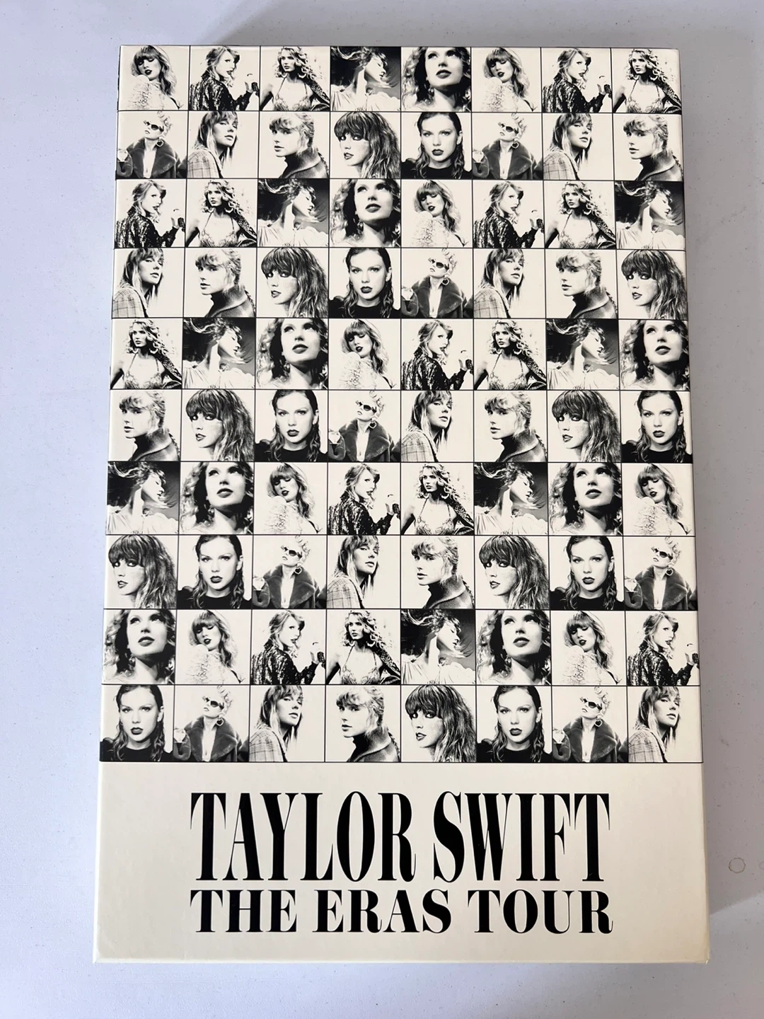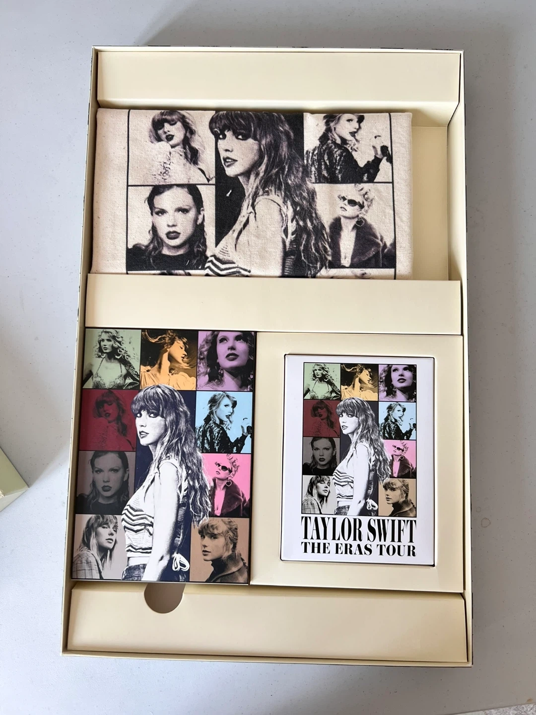 A box full of lovely Taylor Swift swag: 4 posters, 1 cotton tote bag, 1 Lapel pin, 1 card with 1 lanyard. All in a beautifully curated box.