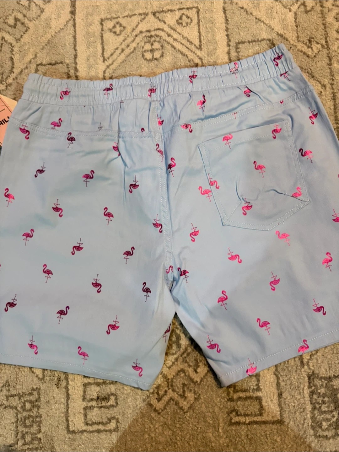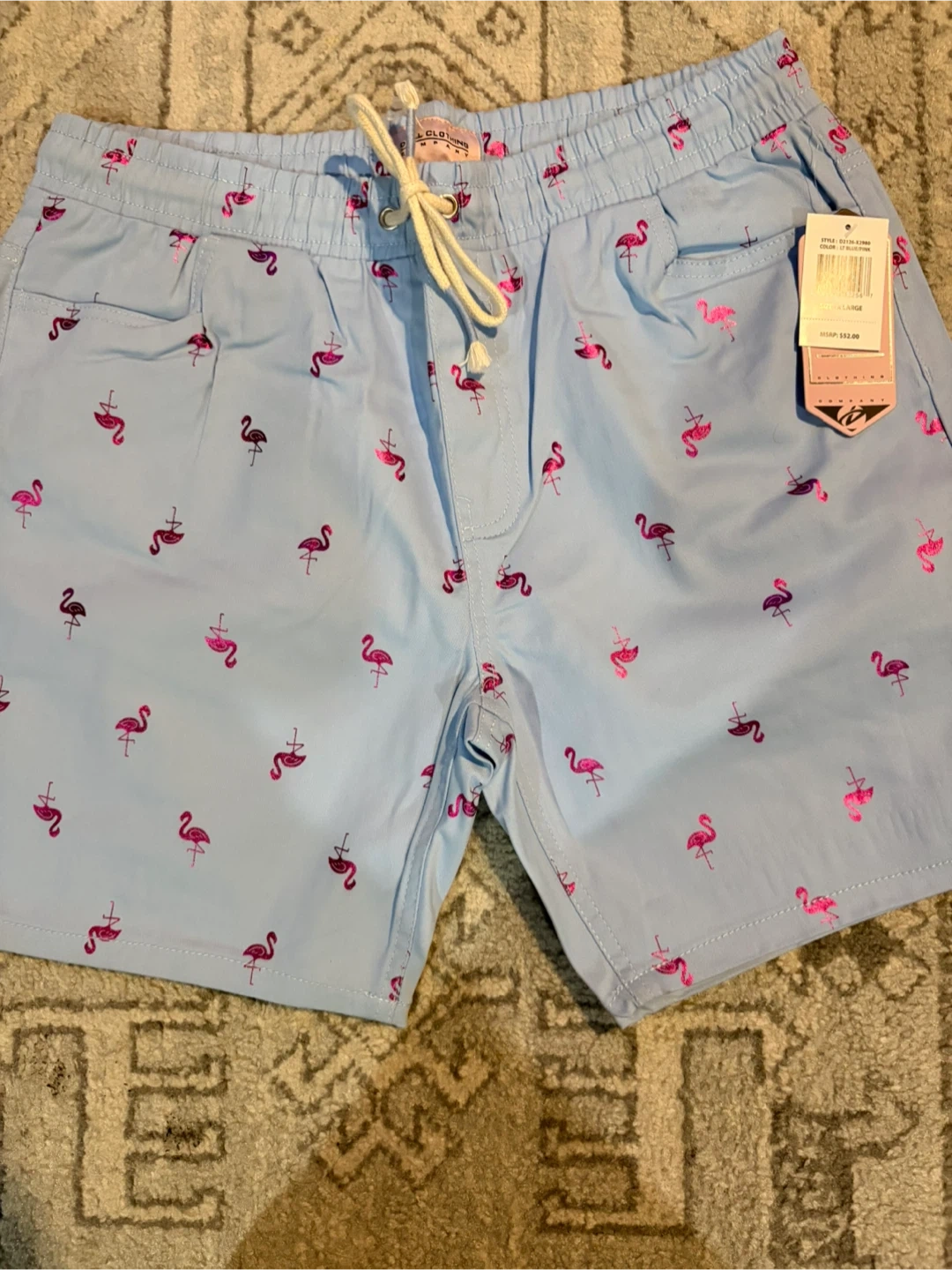 20These Tailor Vintage shorts feature a fun flamingo print on a light blue background. They're a size large and have a comfortable elastic waistband with a drawstring. Perfect for a casual summer day! Size XL men’s