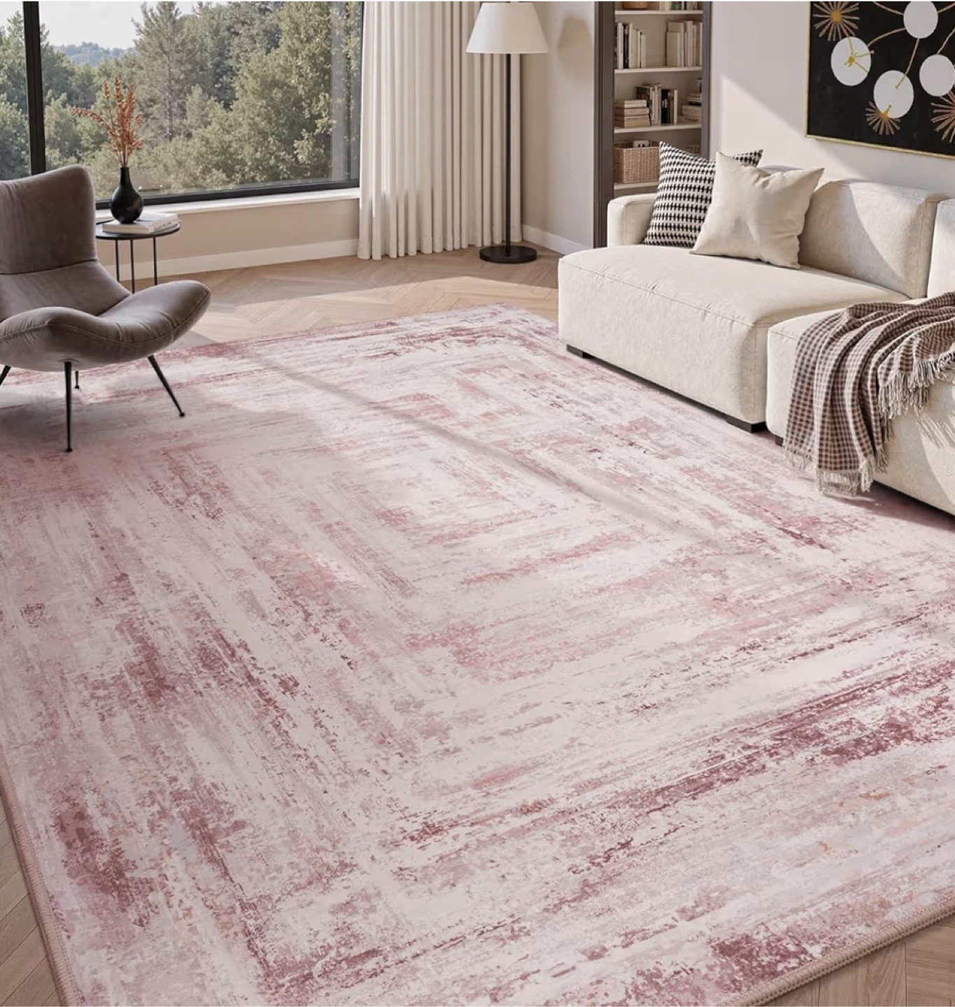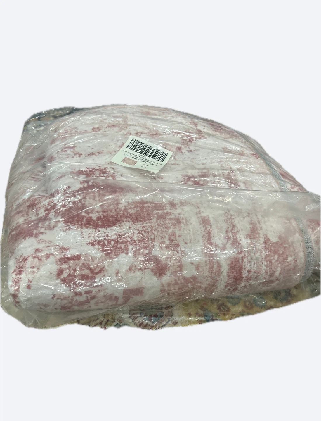 Here's a lovely area rug perfect for adding a touch of warmth to any room! It measures 8 feet by 10 feet and features a beautiful pink and white pattern. It's in great condition and ready to be placed in your home..
