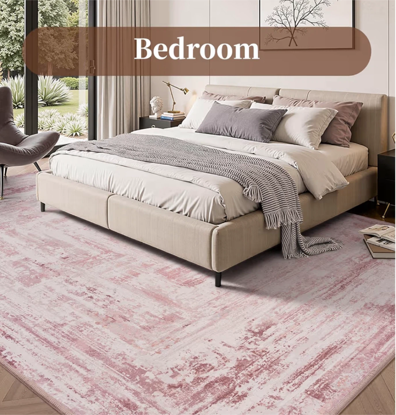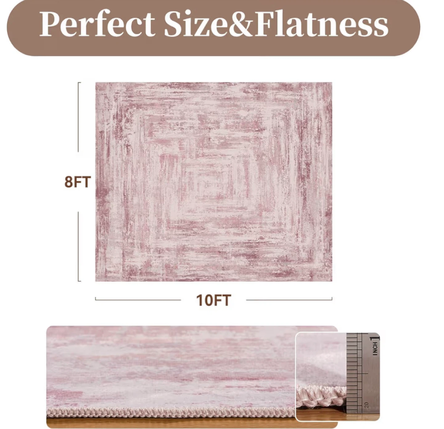Here's a lovely area rug perfect for adding a touch of warmth to any room! It measures 8 feet by 10 feet and features a beautiful pink and white pattern. It's in great condition and ready to be placed in your home..