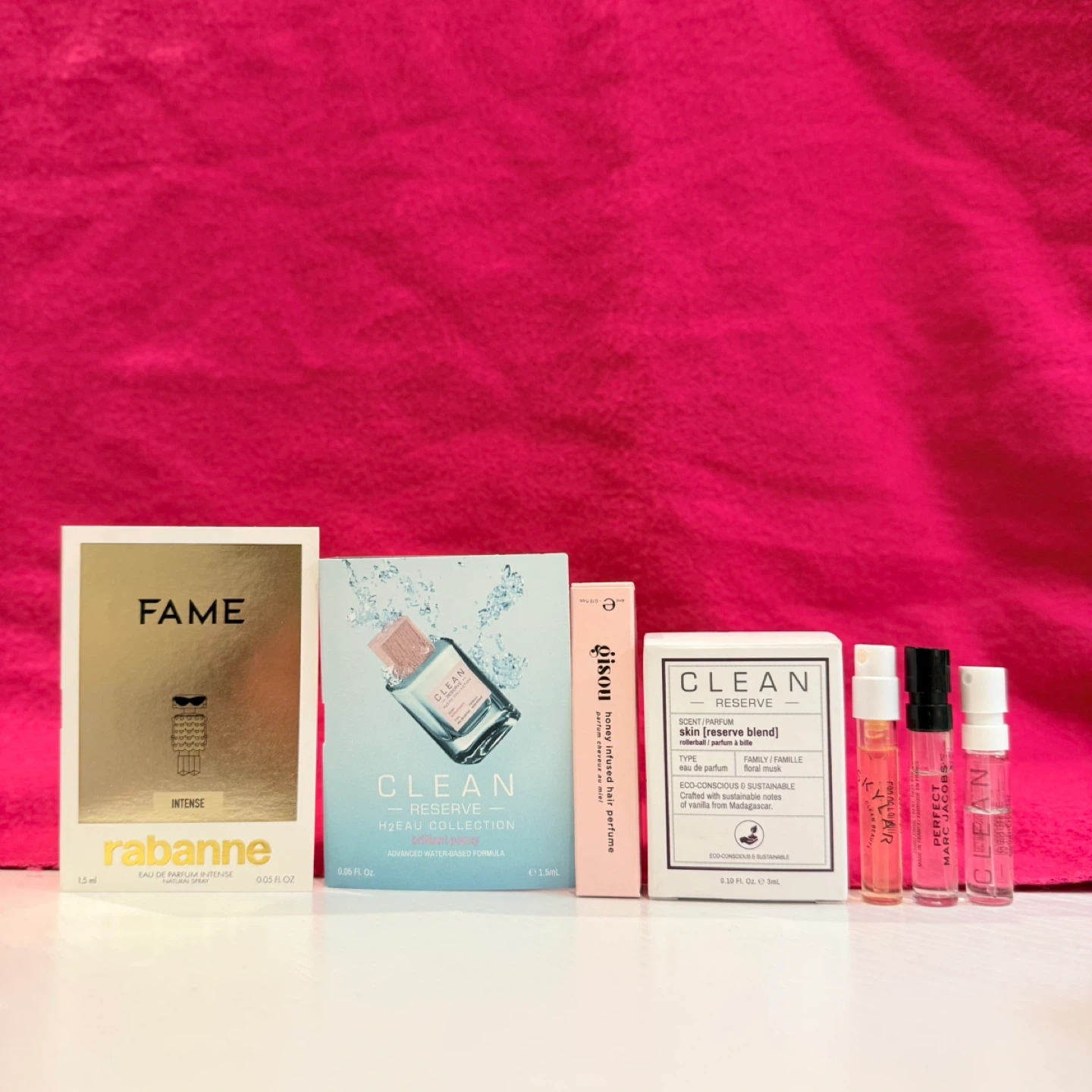 237• Clean Reserve Skin Perfume Oil Rollerball Samples: • Paco Rabanne Intense • Clean Reserve Brilliant Peony (H2eau Collection) • Gisou Honey Infused Hair Perfume • Skylar Boardwalk Delight • Marc Jacobs Perfect • Clean Reserve Radiant Nectar