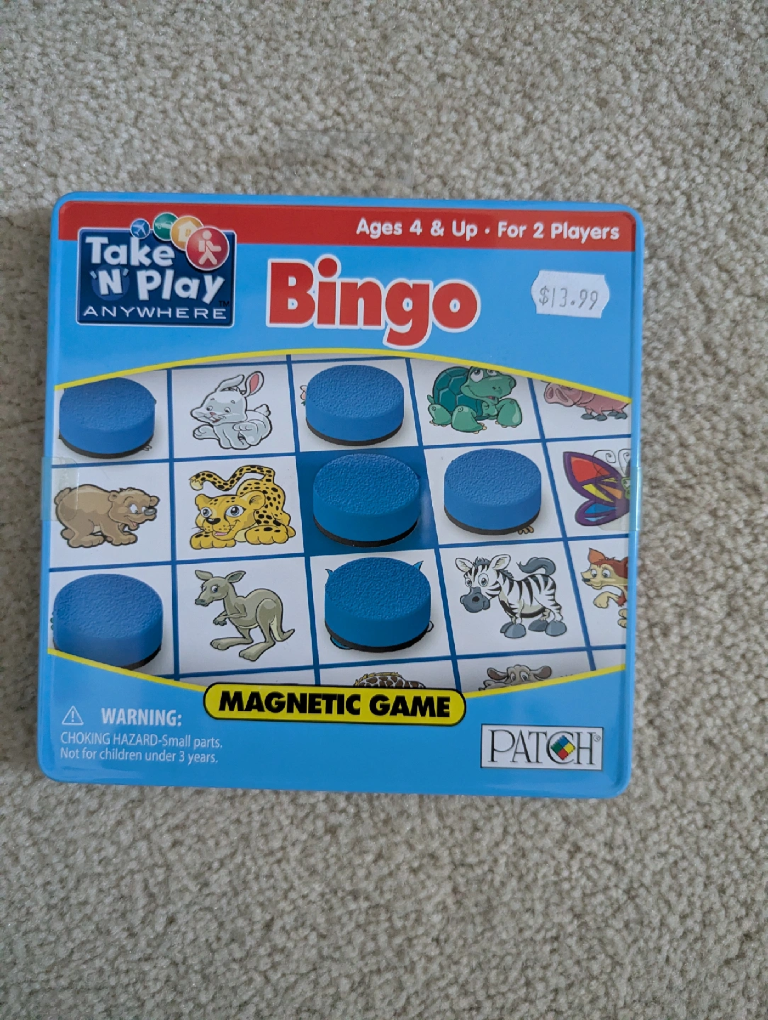 68Take 'N Play Anywhere Bingo game, perfect for ages 4 and up! It's a magnetic game for two players. Originally bought for $13.99