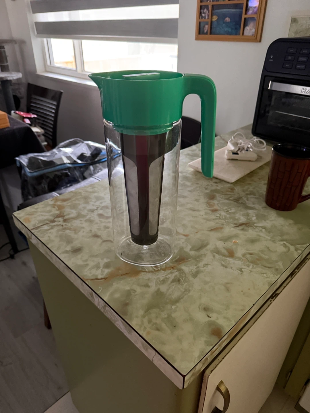 12Selling a Cold Brew Tea Maker. It's a pitcher style with a green lid and handle, and a mesh filter insert. Great for making coffee or tea!