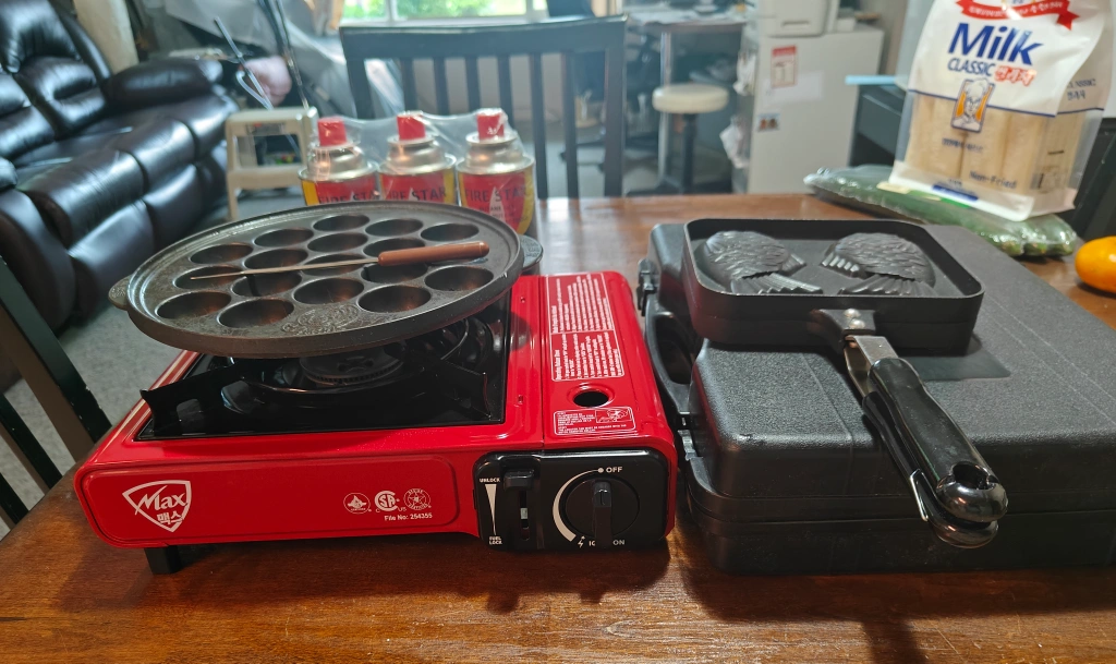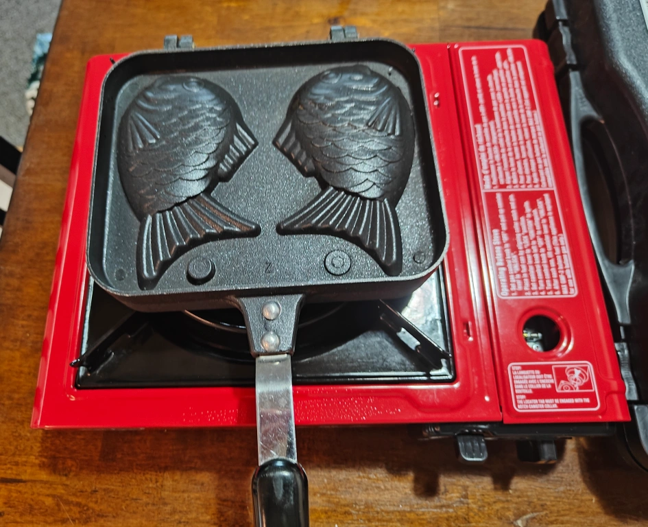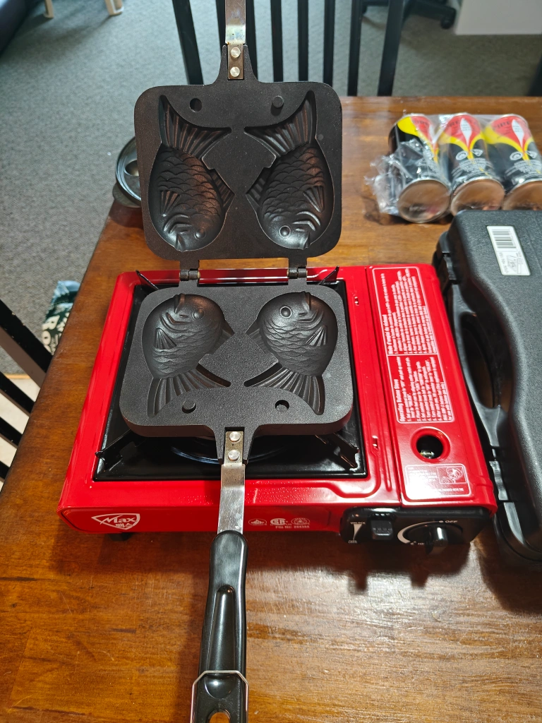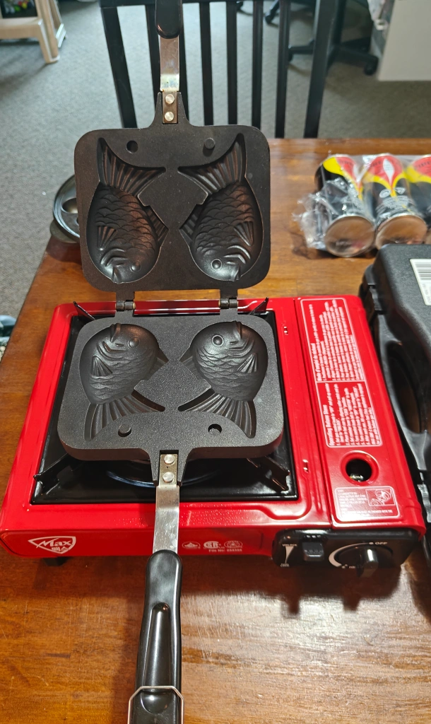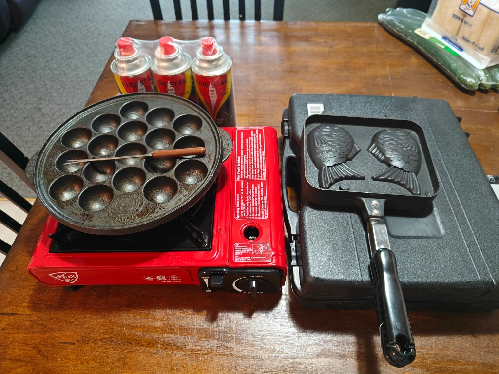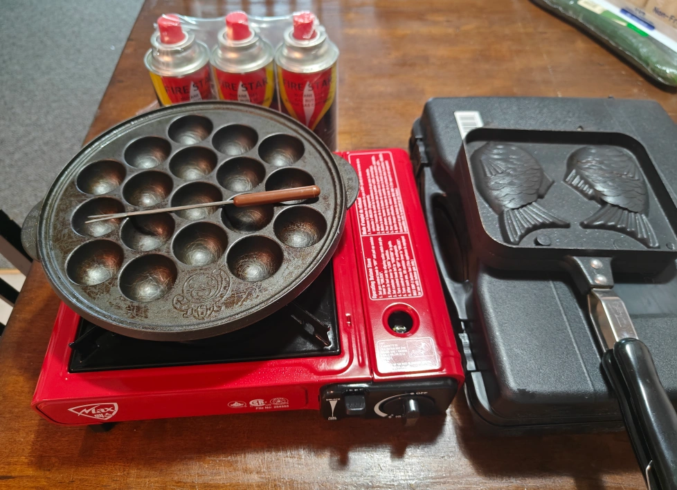 This set includes a portable gas stove with an included carrying case and 3 unused gasoline canisters. A small taiyaki pan for making Japanese Red Bean fish Pancakes, it really works, cooks 2 pancakes under 10 minutes from medium to high heat. A medium Takoyaki pan ( used in Japan years ago), can still make Takoyaki with it. A Takoyaki sharp stick to flip over the Takoyaki. If you're interested in certain items of the set, message me so we can negotiate a price.