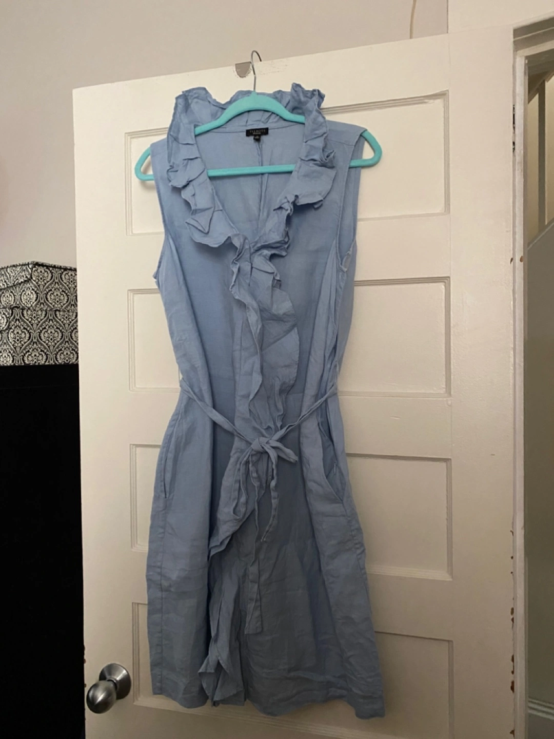 A cute Talbots linen dress in a light blue colour! It's sleeveless and has a ruffled neckline and a tie at the waist with pockets. Perfect for summer!