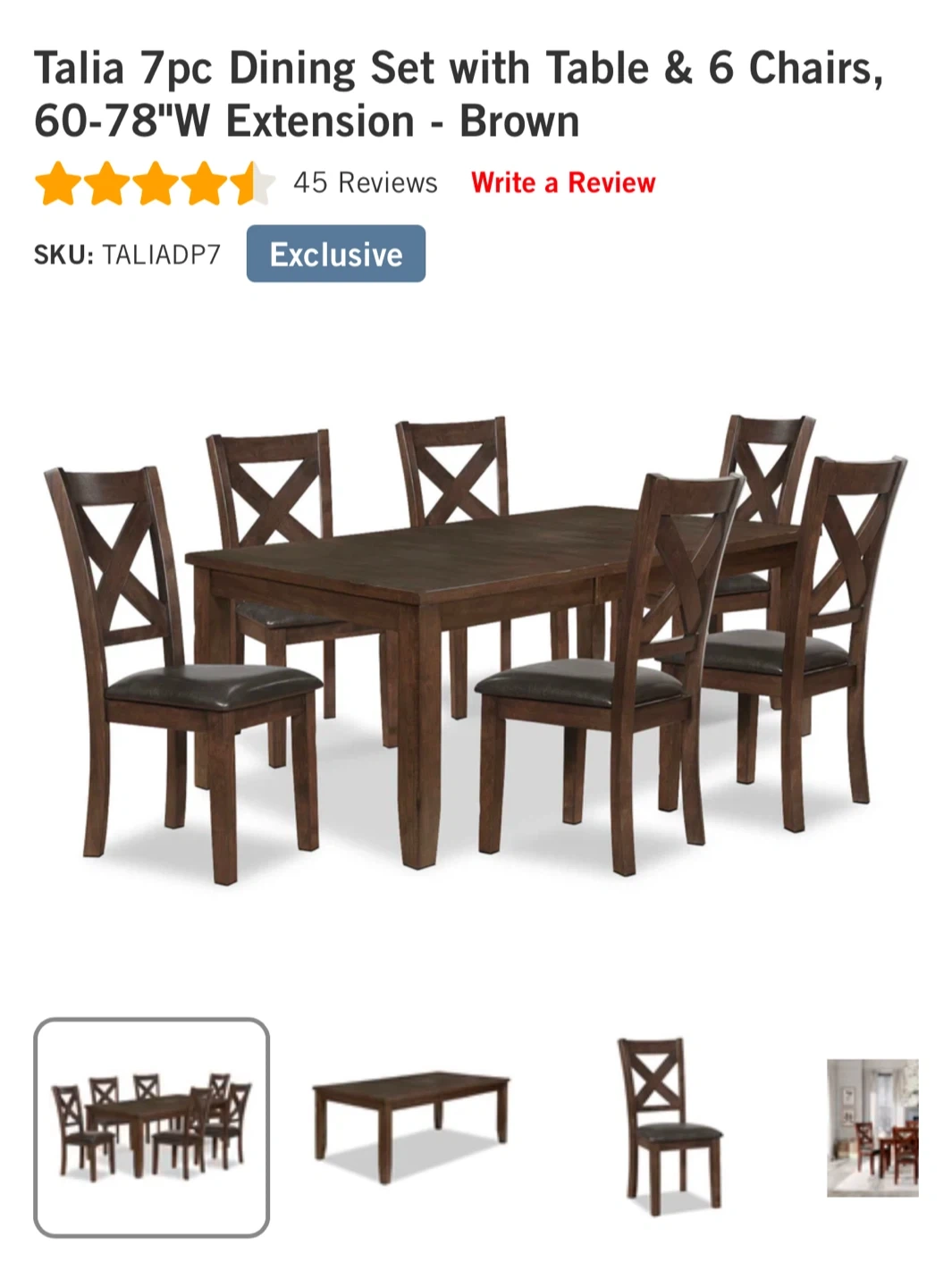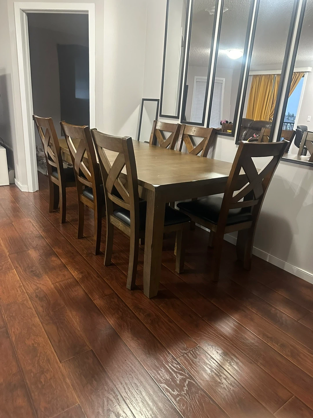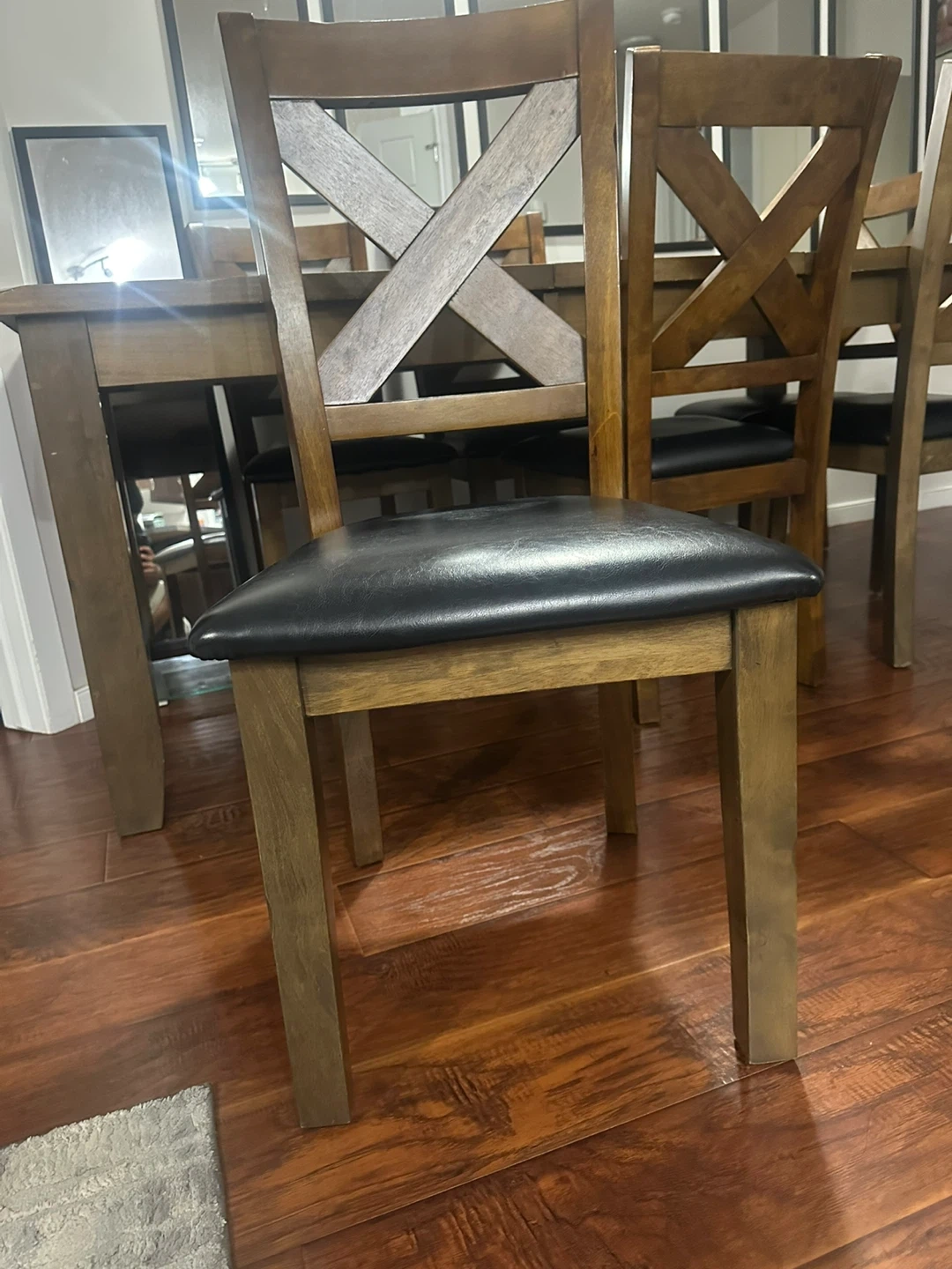 10Selling a beautiful Talia 7-piece dining set that includes a solid dining table and six matching chairs. The table extends from 60" to 78" wide, perfect for family dinners or gatherings. It features a warm brown finish, and the chairs have a distinctive X-back design for a stylish touch. Purchased 3 years ago from The Brick for $1,050 — still in great condition. Only selling because I’m moving back home.