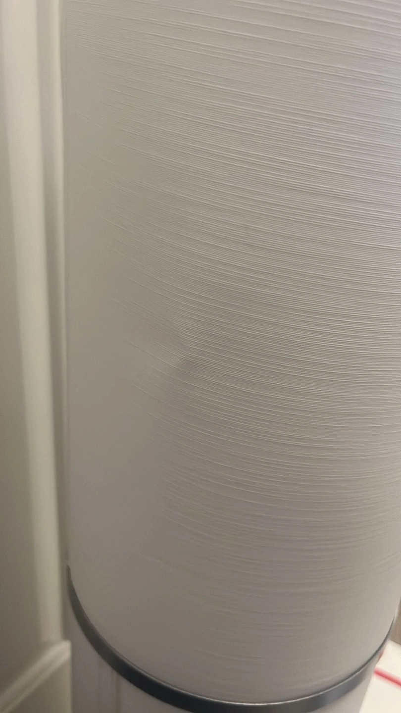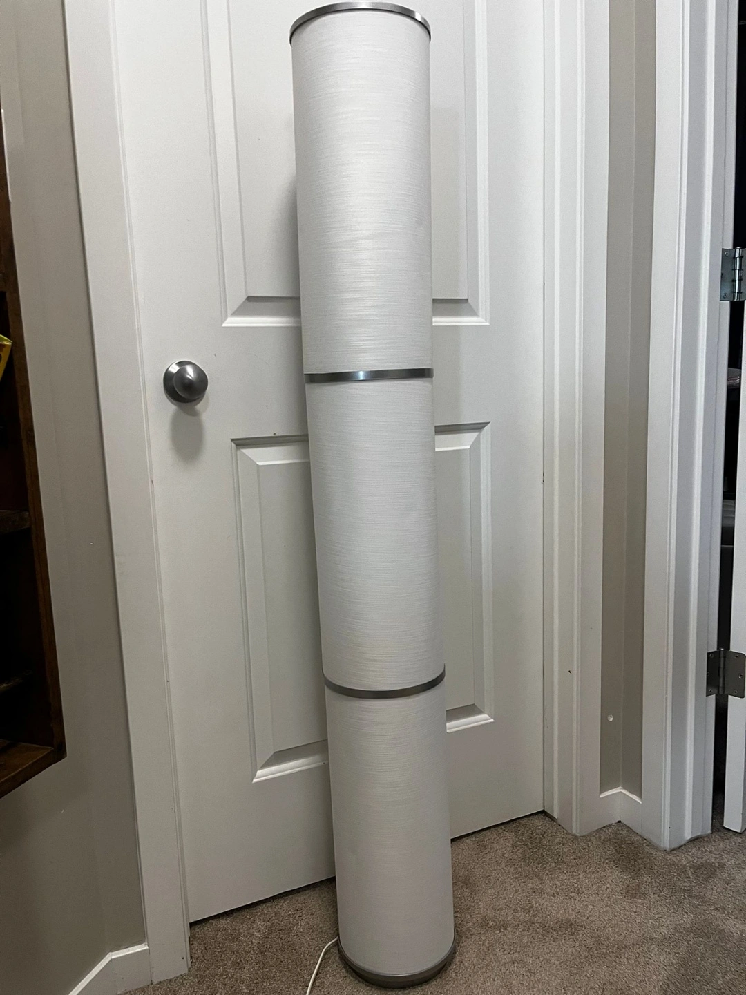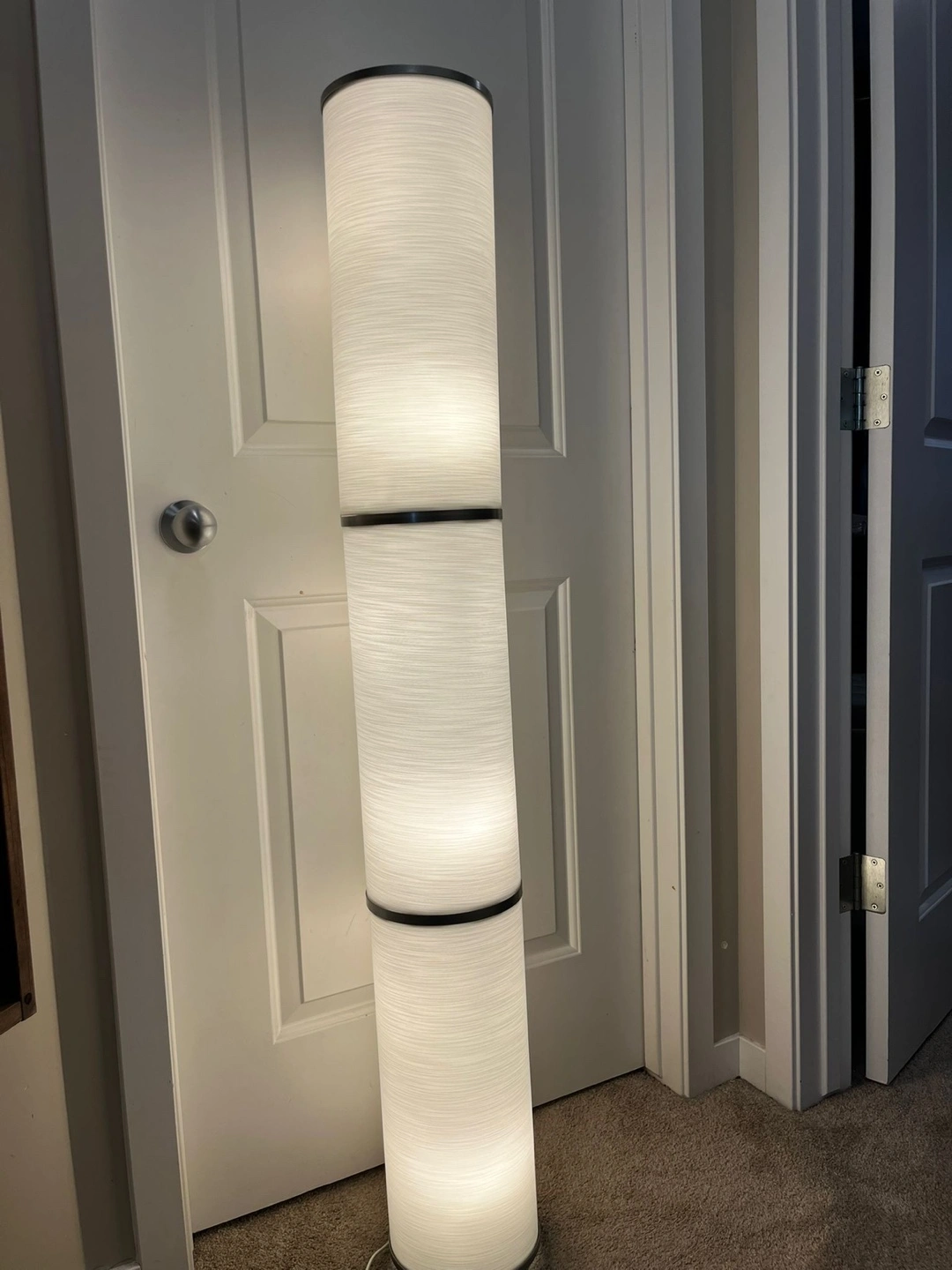 A three-section floor lamp. Cylindrical lampshade with metallic accents. Great for creating a soft ambient light in any space. Small dent as shown in the picture, not very visible.