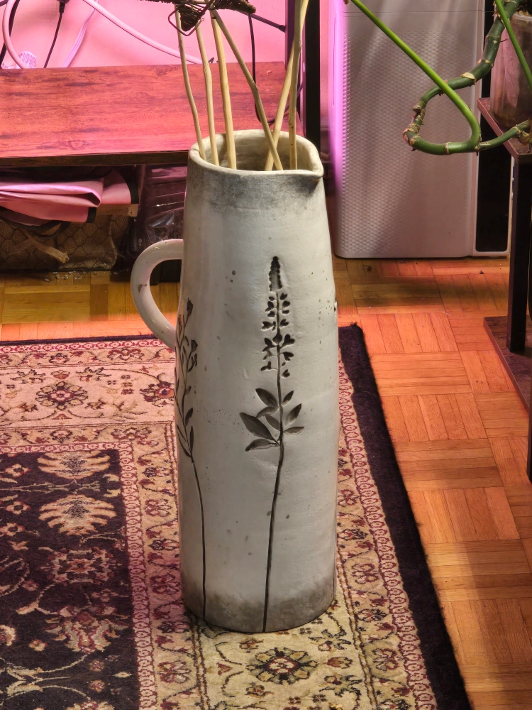 10Selling a tall ceramic vase with a handle. It's a light cream colour with a simple floral design on the front. Decorative purposes. 20" tall