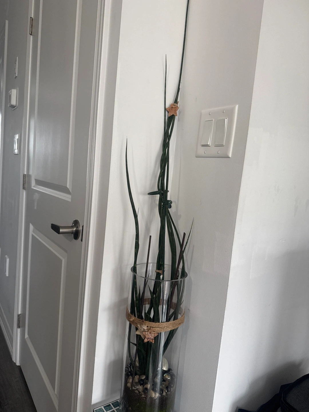 Selling a tall snake plant in a glass vase. It's a beautiful addition to any room and very easy to care for. The vase is decorated with a jute rope and starfish accents, adding a touch of coastal charm.