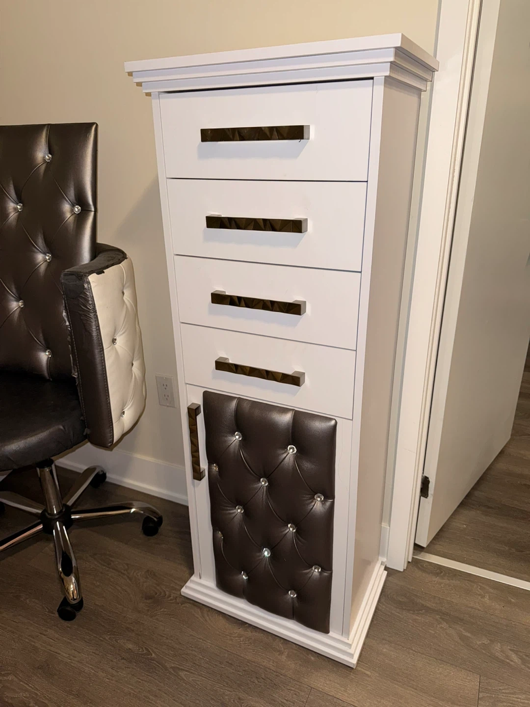 10Modern tall chest of drawers / storage cabinet in excellent condition. Perfect for bedroom, beauty room, walk-in closet, or salon setup. > Solid white finish with chrome geometric handles > Stylish diamond-tufted faux-leather panel with crystal accents > 3 smooth-glide drawers + 1 top mini-drawer + bottom cabinet for larger items > Compact footprint; great for smaller spaces > Clean, sturdy, and fully assembled, just take home and use! > Dimension: 12”x17.5”x51.5” Ideal for clothes, beauty products, hair tools, or accessories. Smoke-free and pet-free home. Asking 180 obo