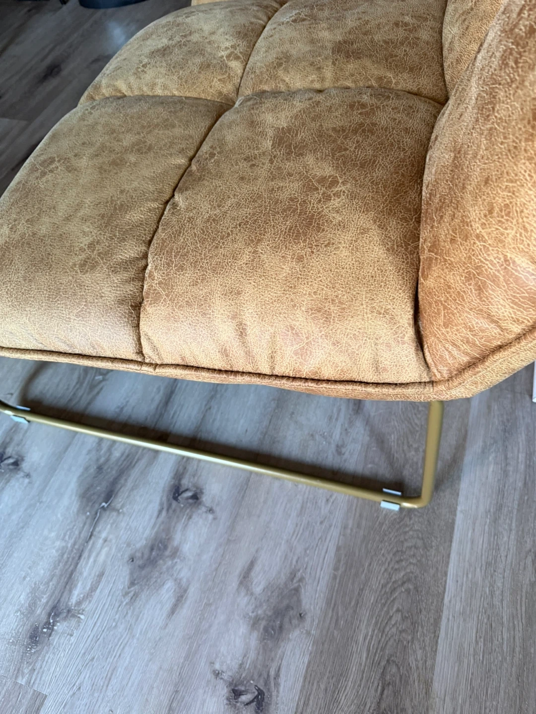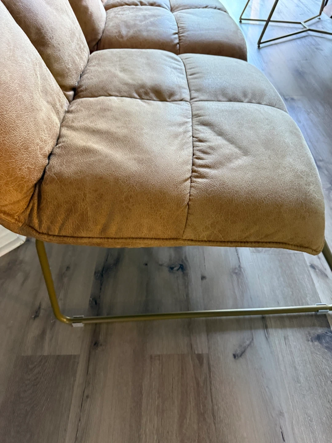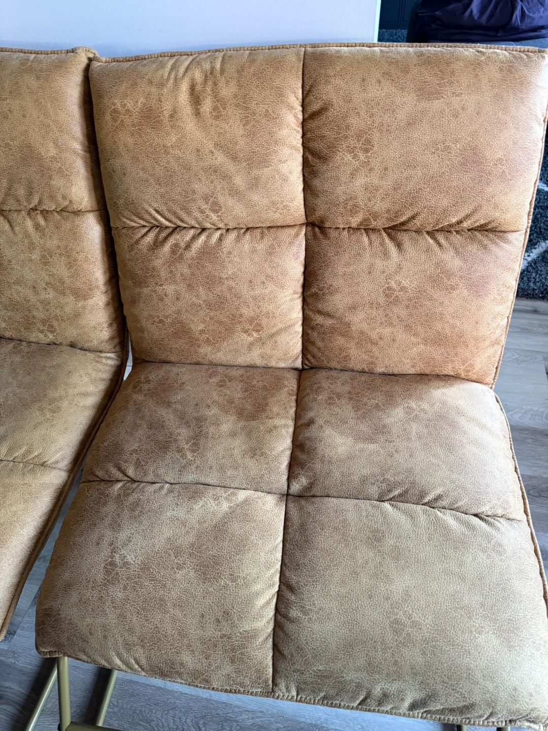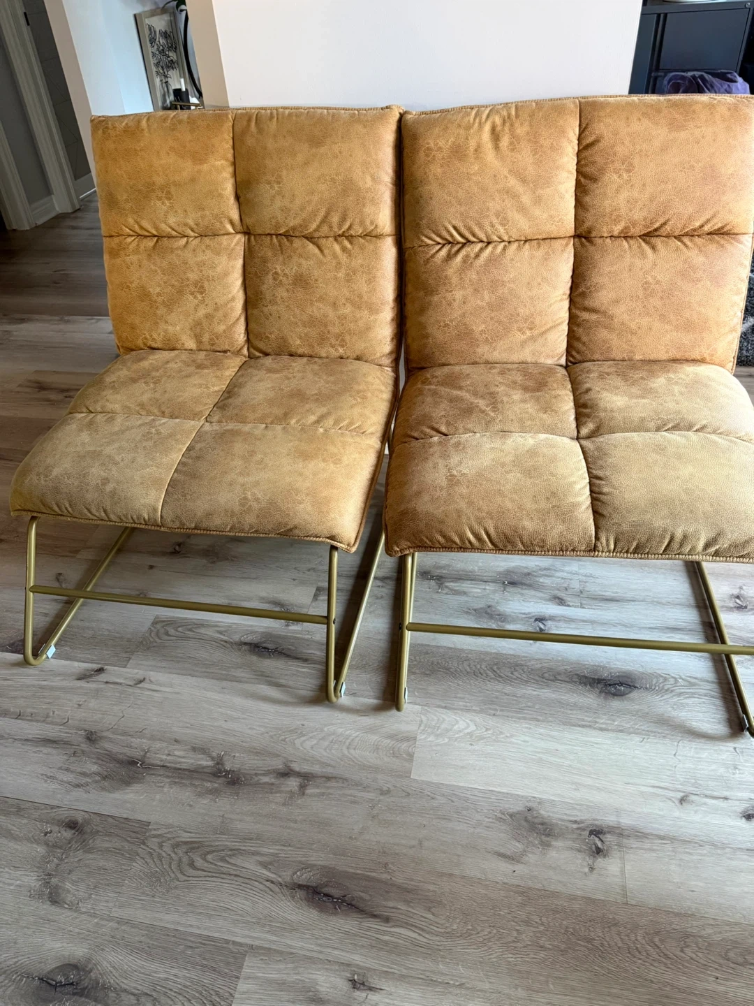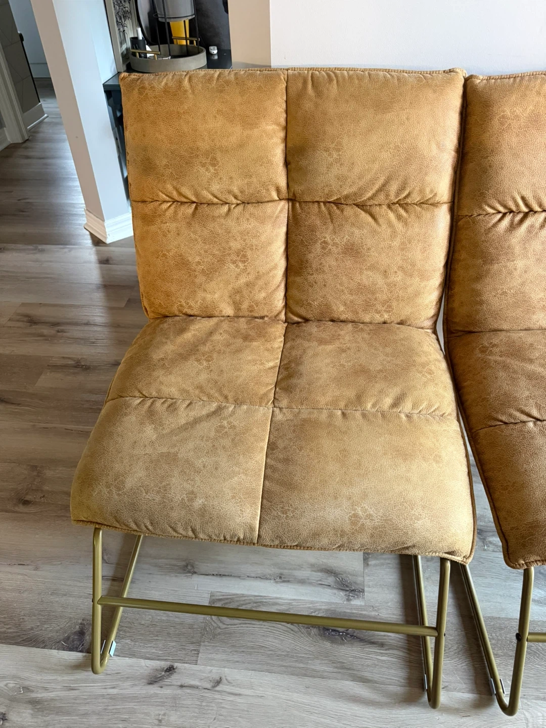 10Selling a set of tan faux leather dining chairs. They feature a quilted seat and back with a gold metal frame. They are in great condition and would look great in any dining room or kitchen!