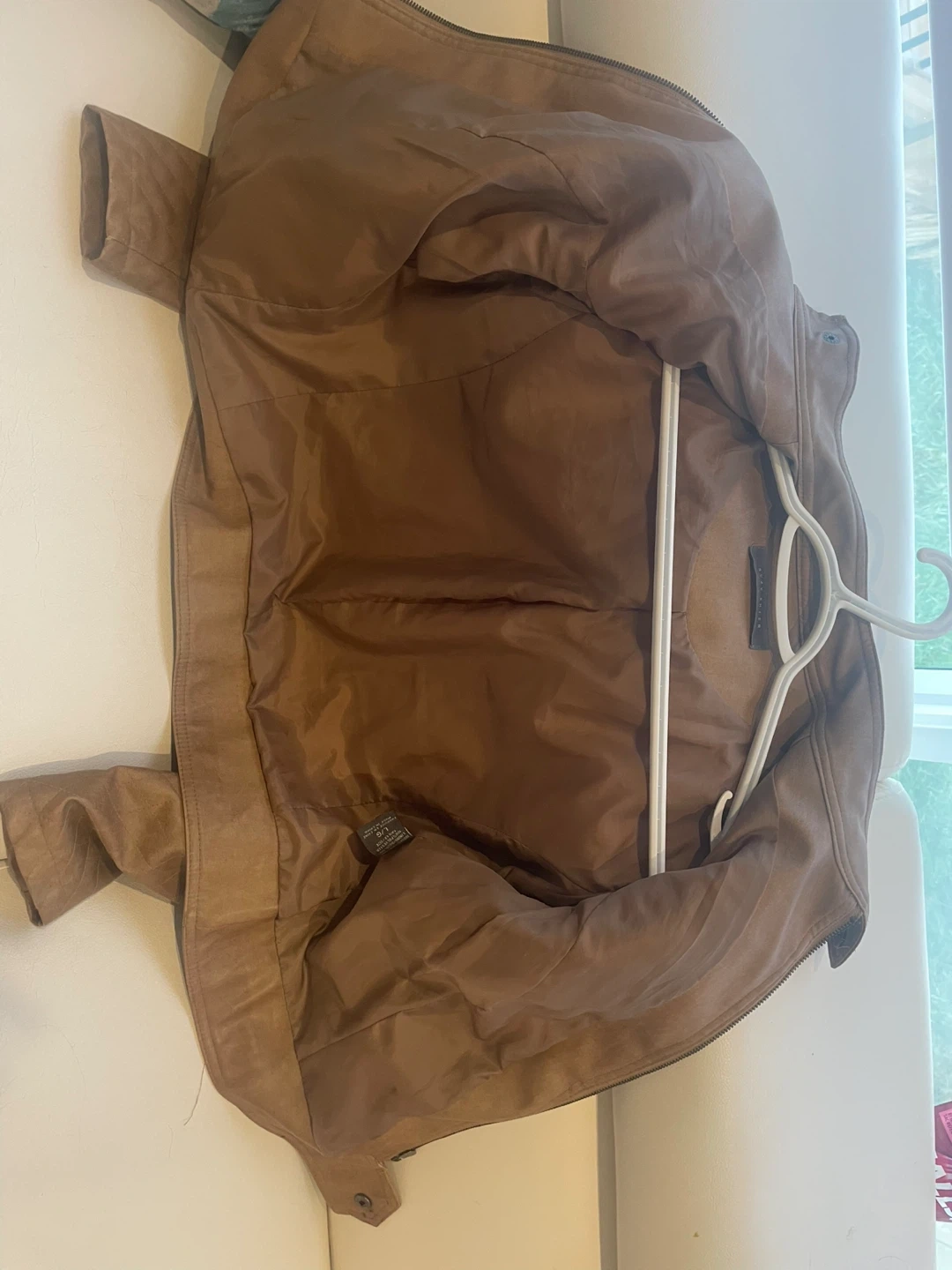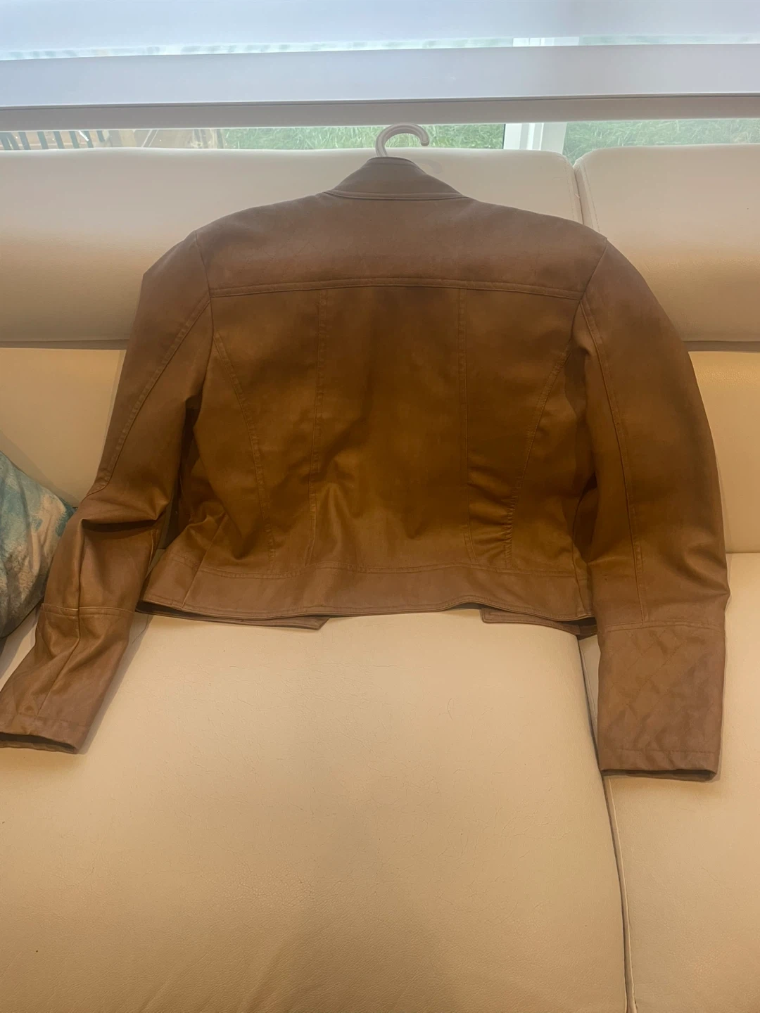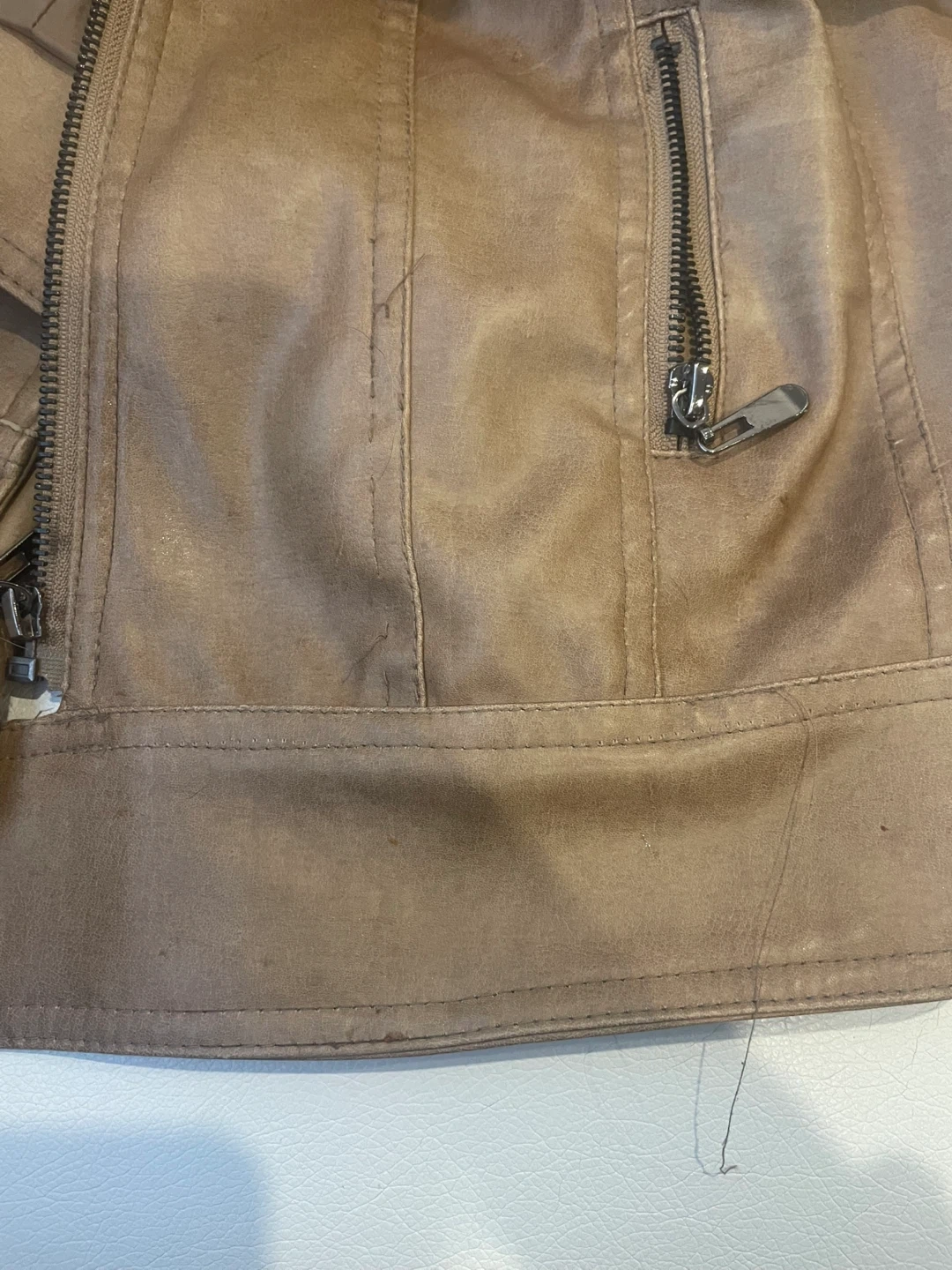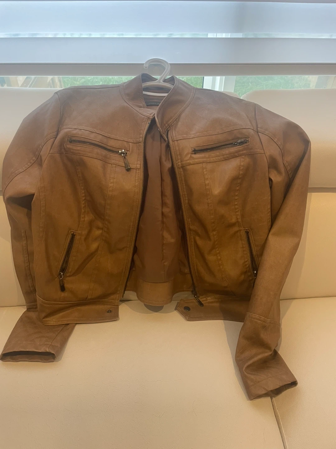 73Selling a tan faux leather jacket. It's in good condition (just a few loose threads on front left) and has a stylish look with zipper details. Perfect for adding a bit of edge to your outfit!