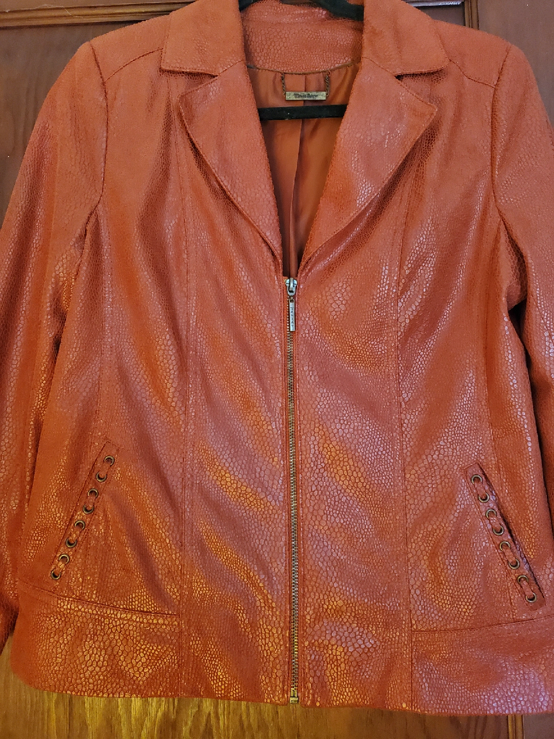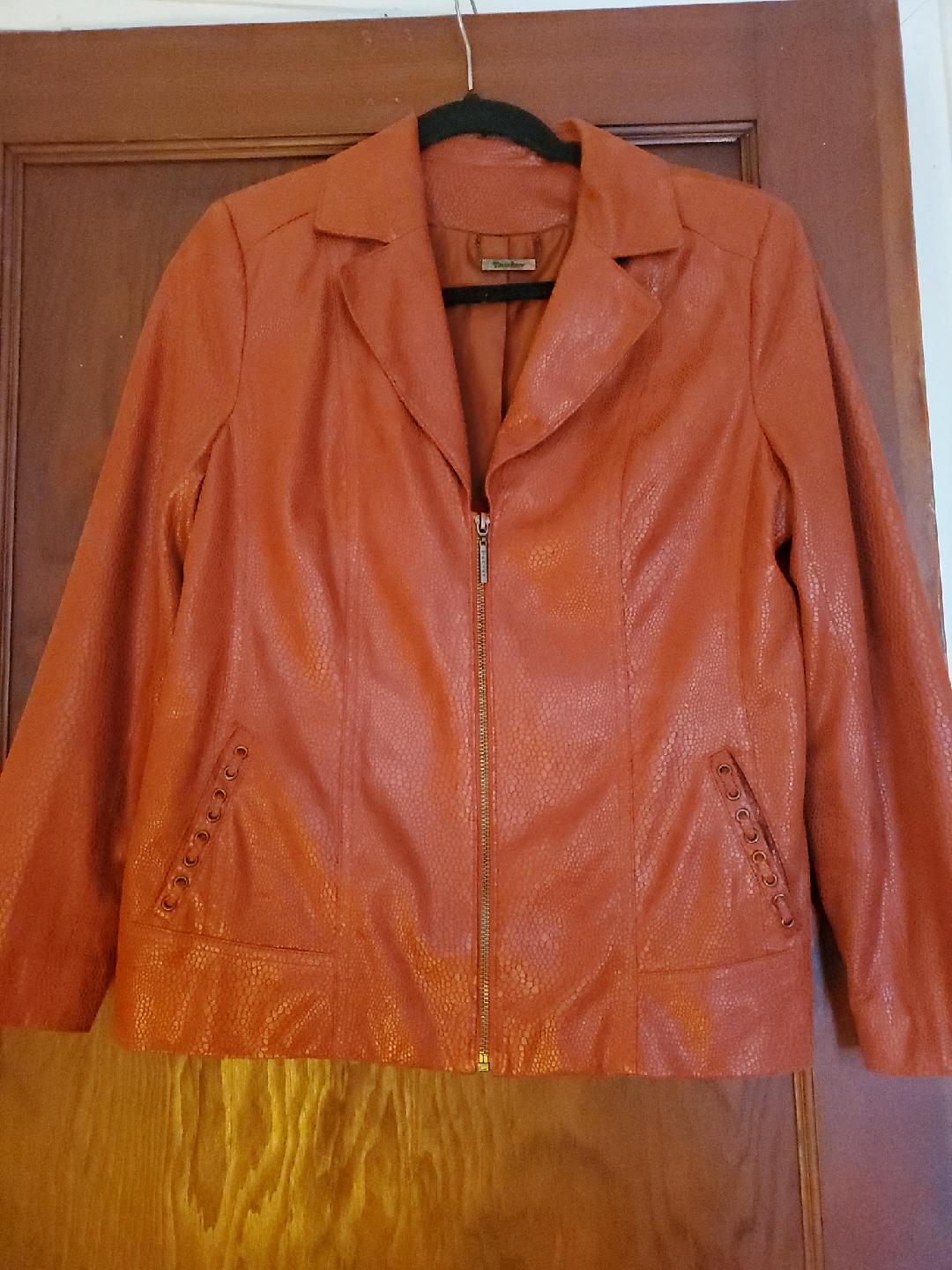 10Here's a Tan Jay orange faux leather jacket. It's made of 100% polyester. It's in great condition and ready for a new home!