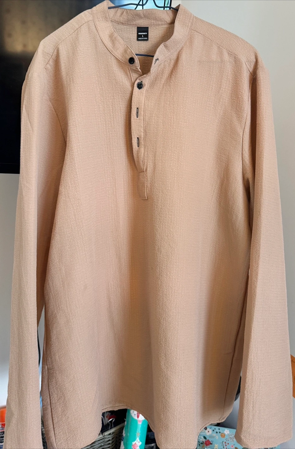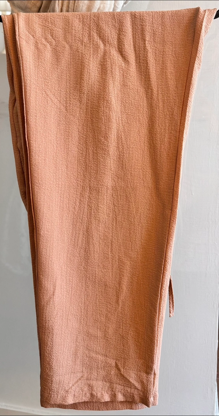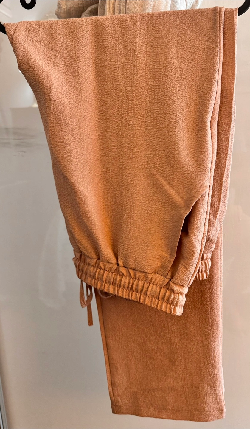46A stylish pant and shirt set. Both pieces feature a textured fabric. Pant has a drawstring. The shirt has a mandarin collar.