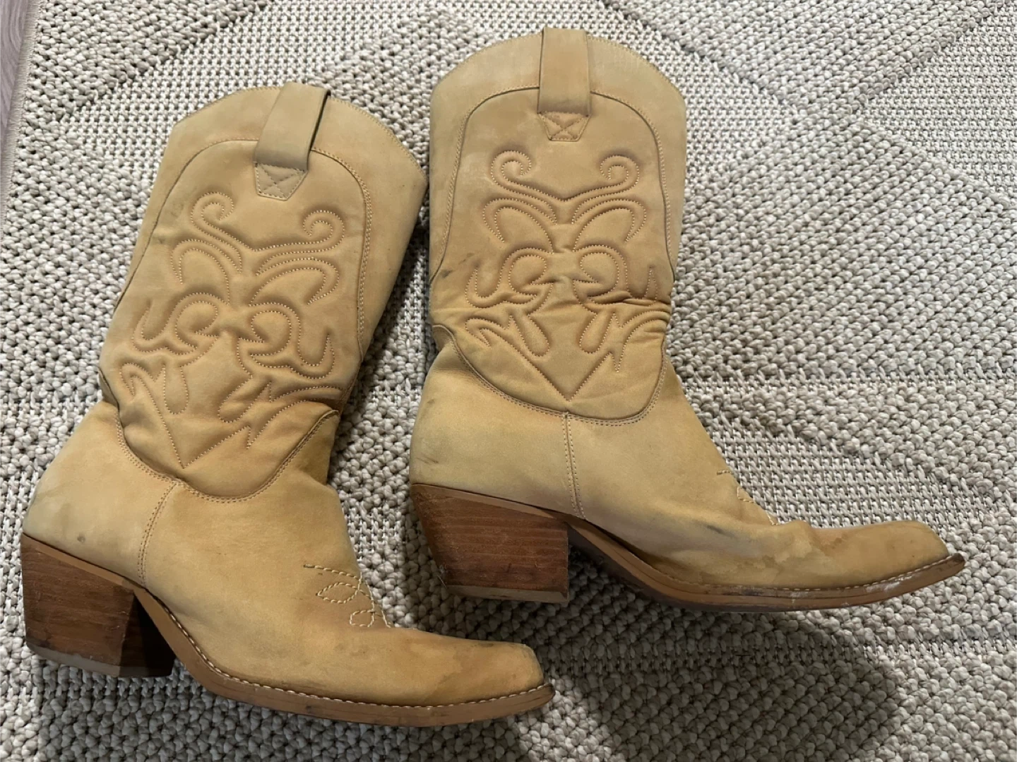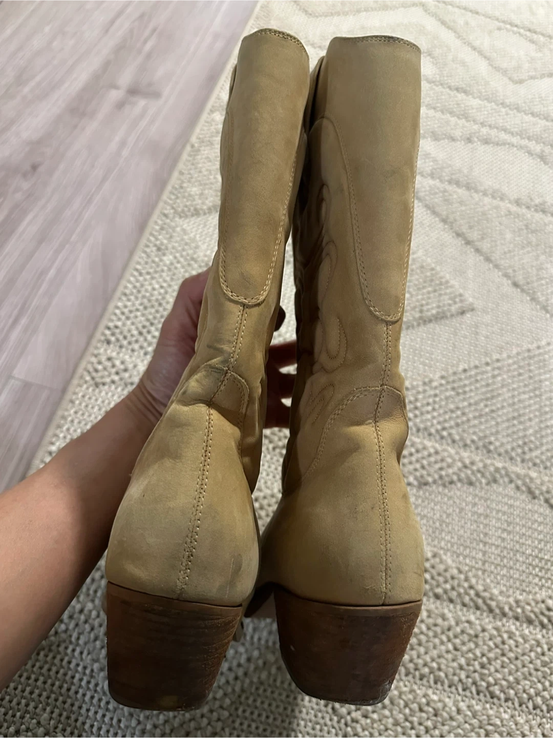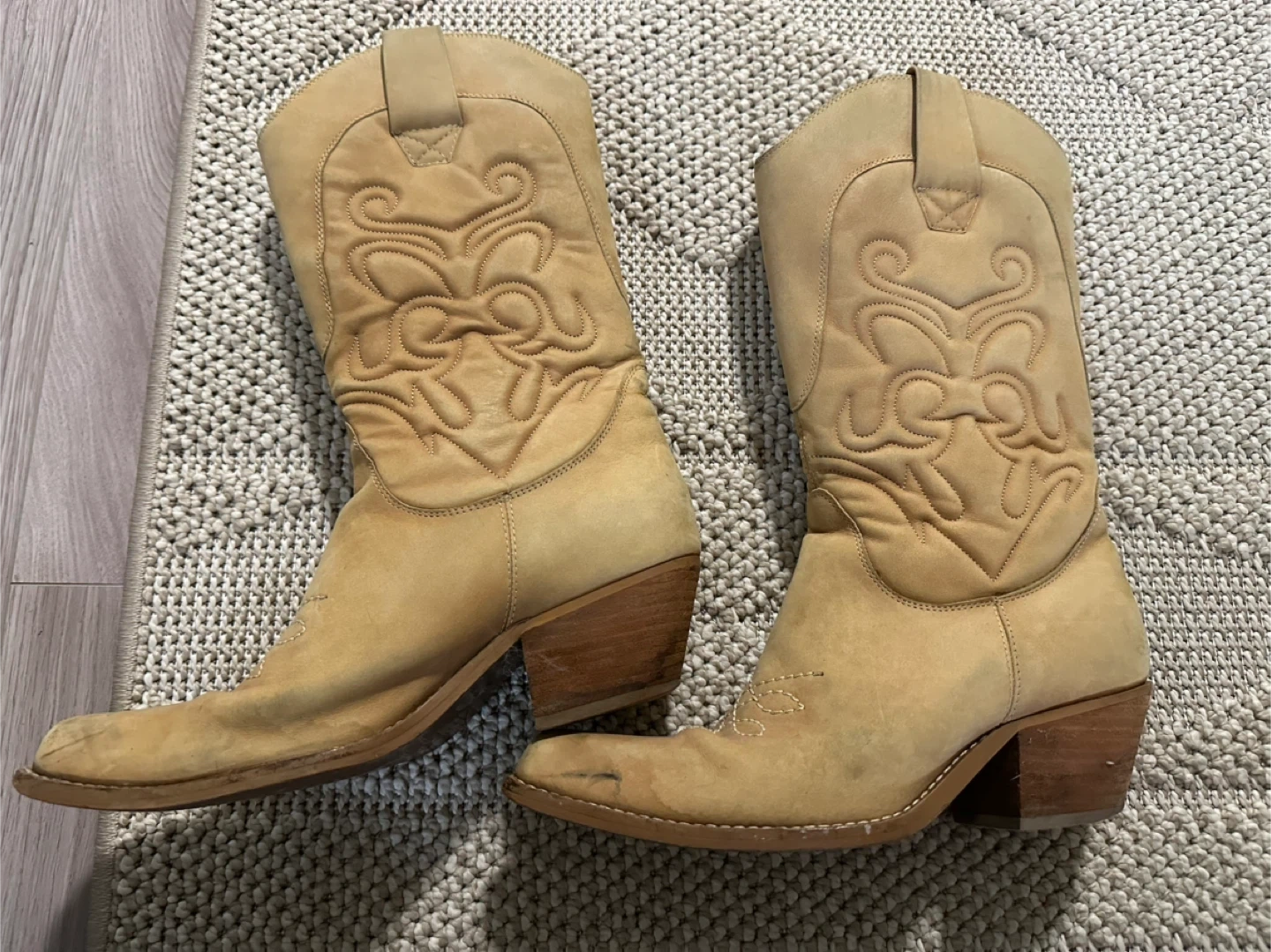 59Selling a pair of tan colour Woman’s cowboy boots. Made in China, size 7.5 Made from nubuck leather, give a soft velvety touch. They're a size 7.5 and have a nice western design. They show some signs of wear, and stain on shoe tips, but still have lots of life left! Very soft and comfortable sole