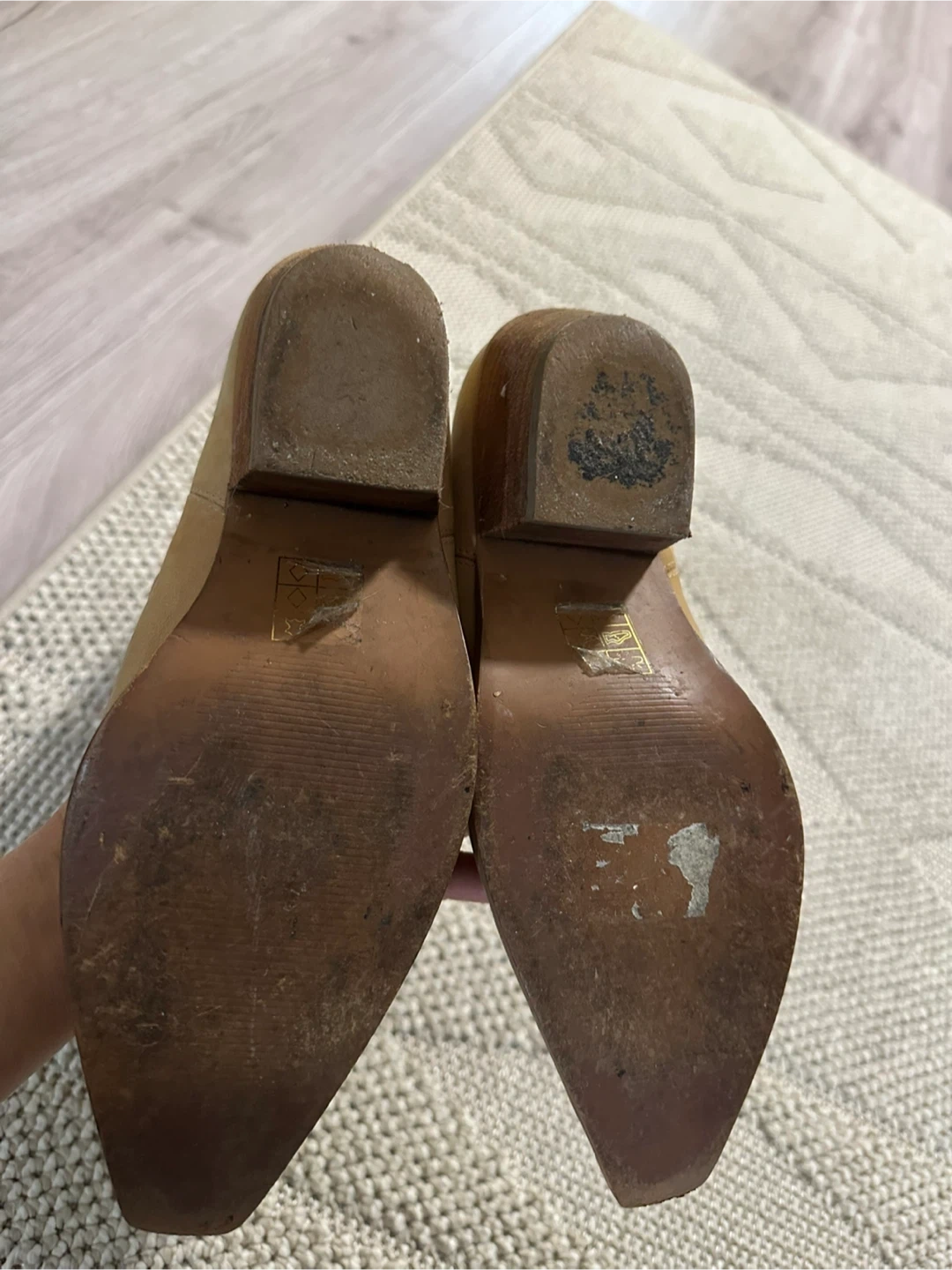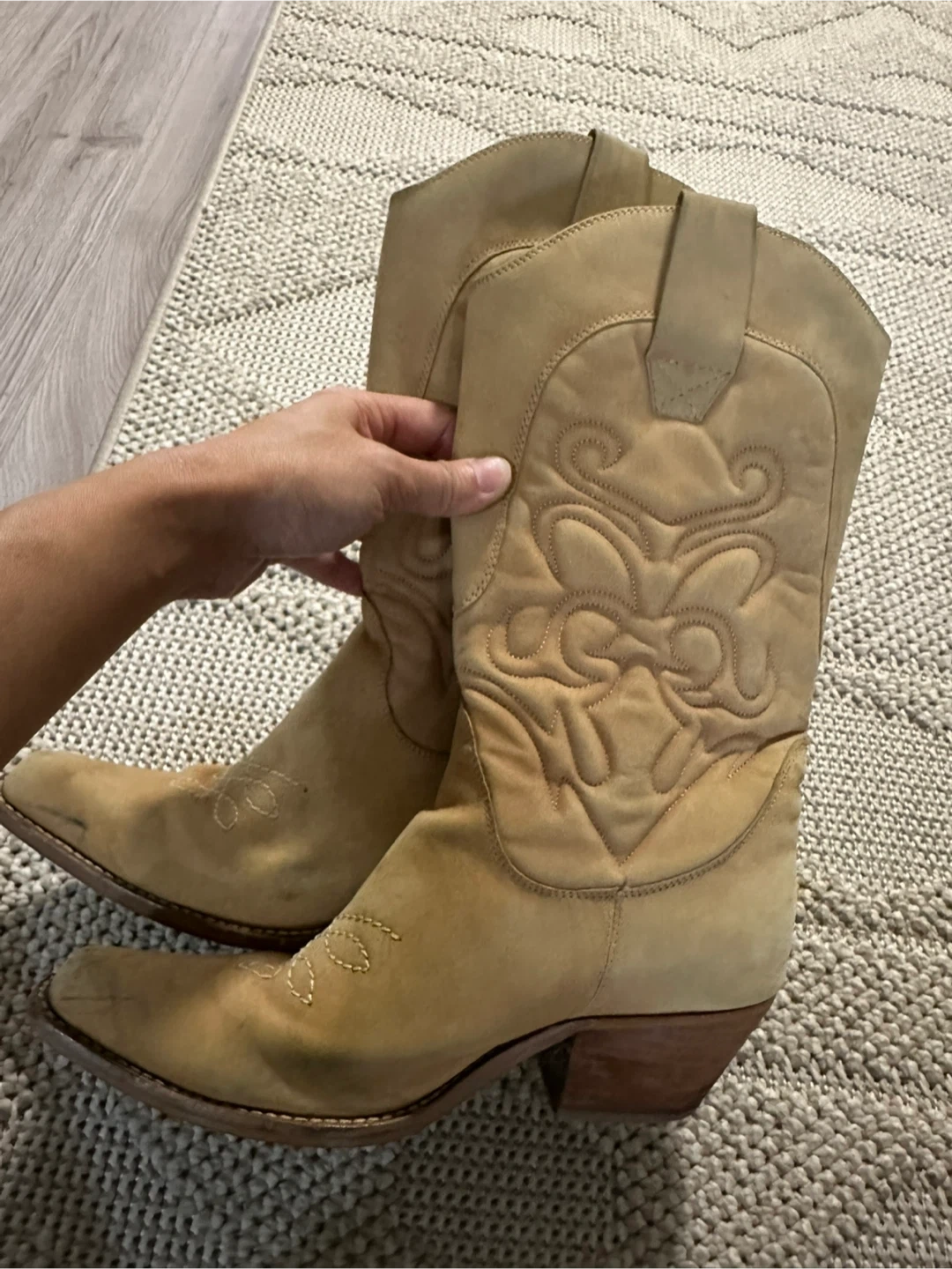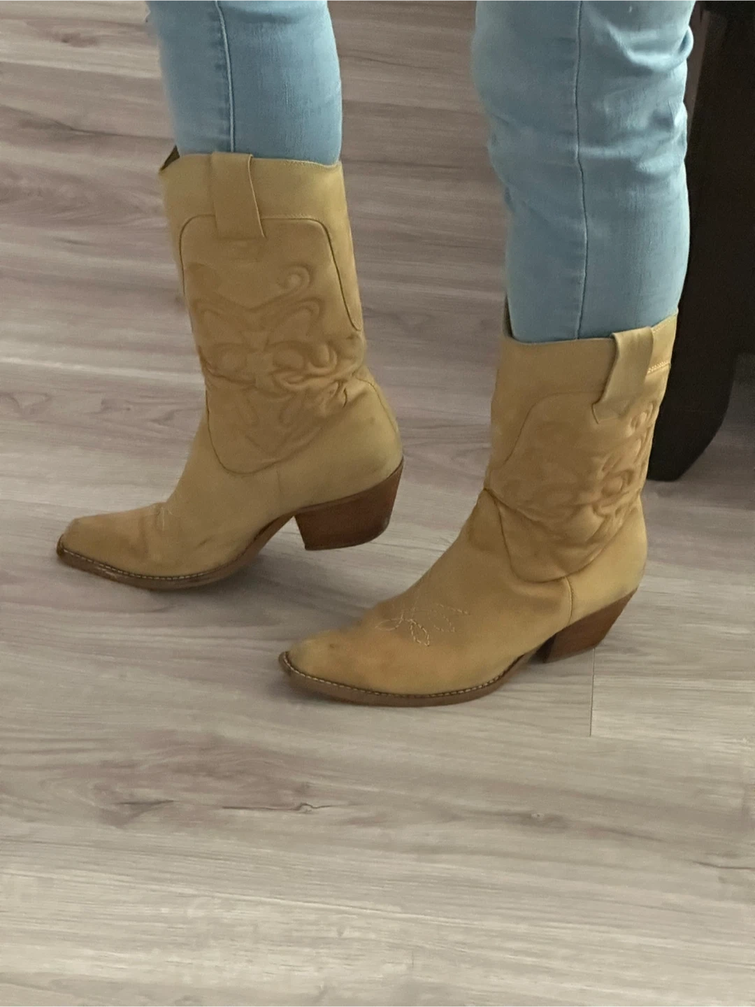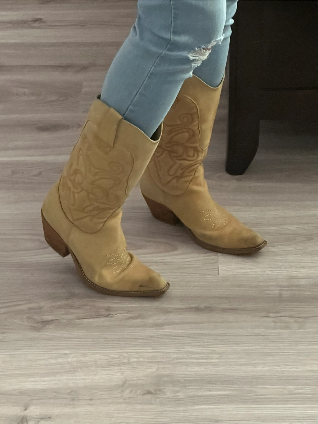 59Selling a pair of tan colour Woman’s cowboy boots. Made in China, size 7.5 Made from nubuck leather, give a soft velvety touch. They're a size 7.5 and have a nice western design. They show some signs of wear, and stain on shoe tips, but still have lots of life left! Very soft and comfortable sole