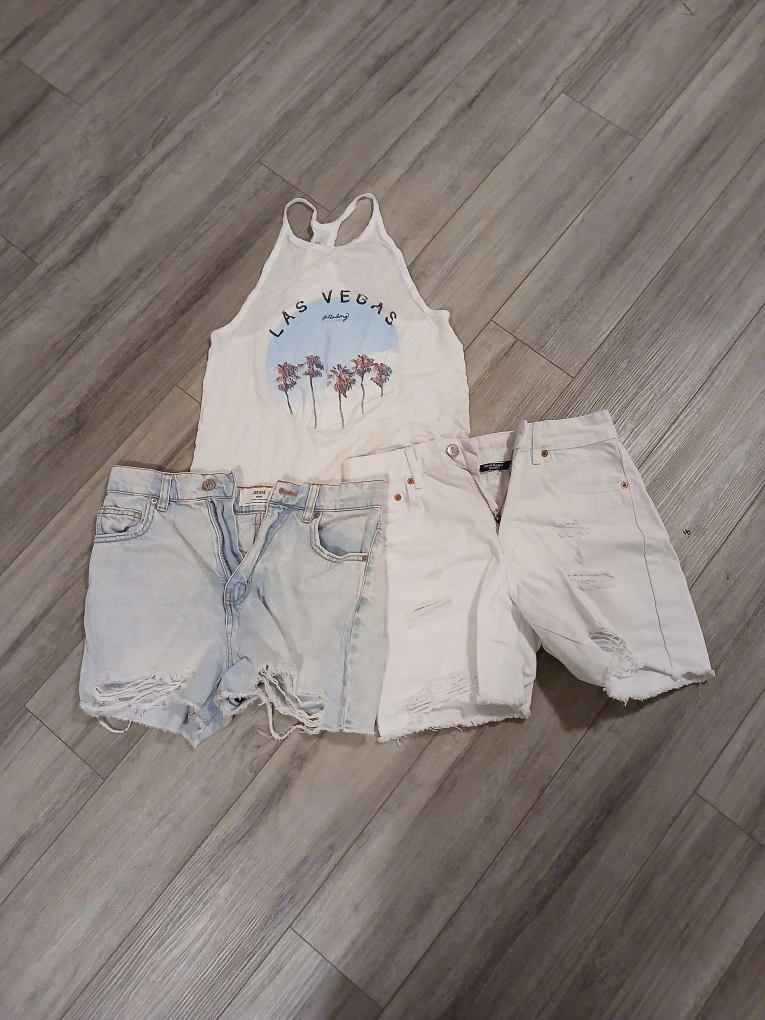 Selling a bundle with a Las Vegas tank top and two pairs of distressed denim shorts. The shorts are in a light wash and white colour. Great for summer!
