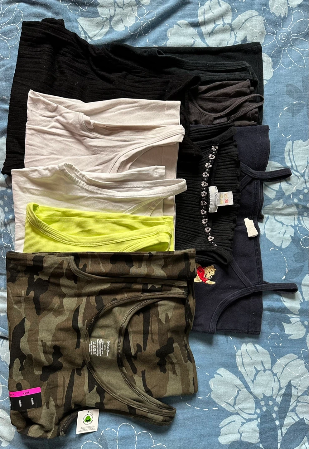 10Selling a bundle of tank tops. There's a variety of colours and styles, including black, white, neon green, and camouflage. One of the tops is a George brand, size XS. Great for layering or wearing on their own!