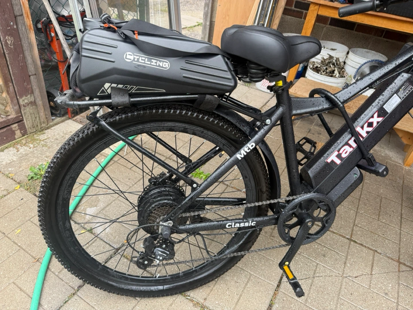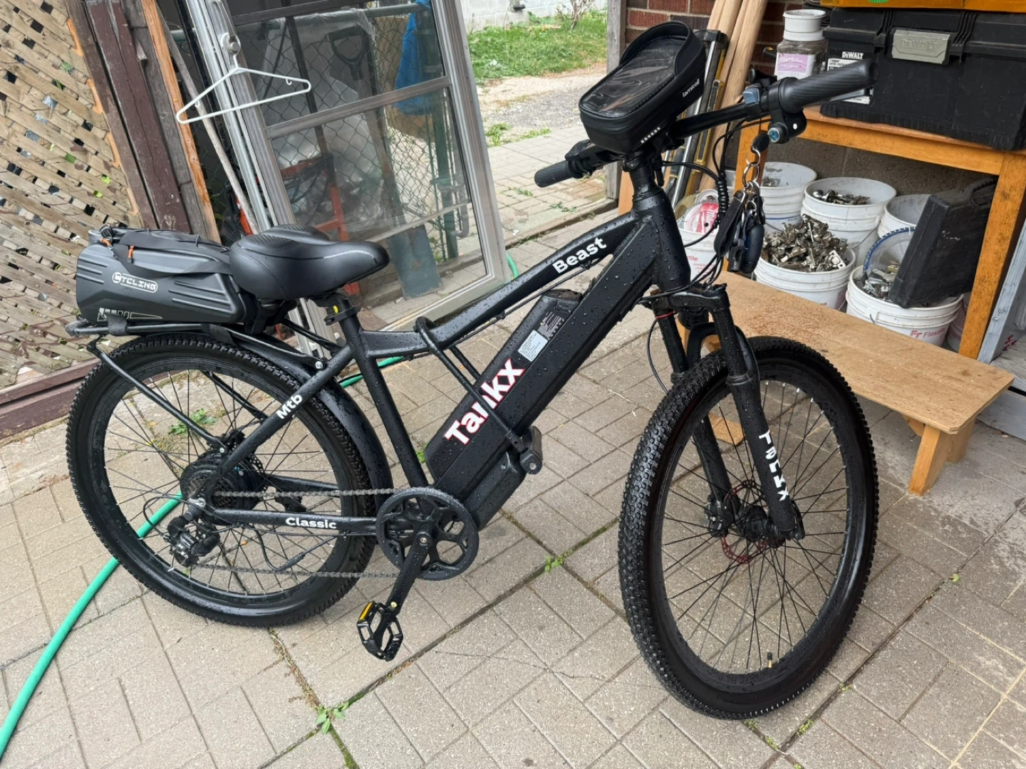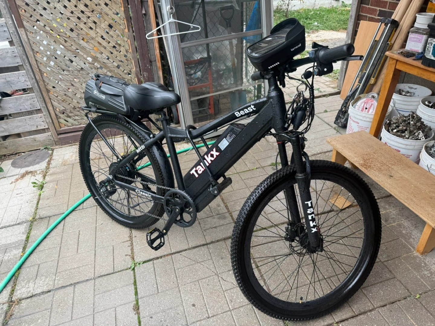 Selling a Tankx Beast electric bike! It comes with a comfortable seat, a phone holder, and a convenient bag for storage. Great for getting around town or enjoying a leisurely ride!