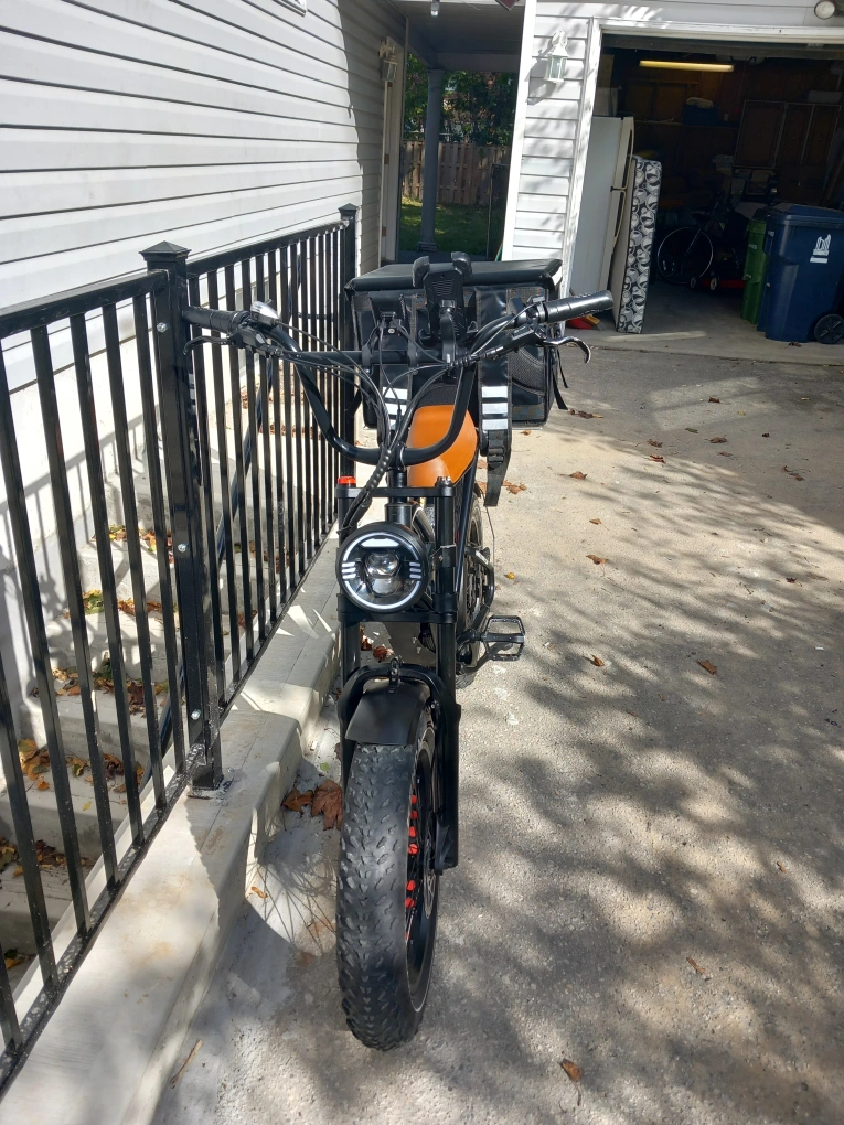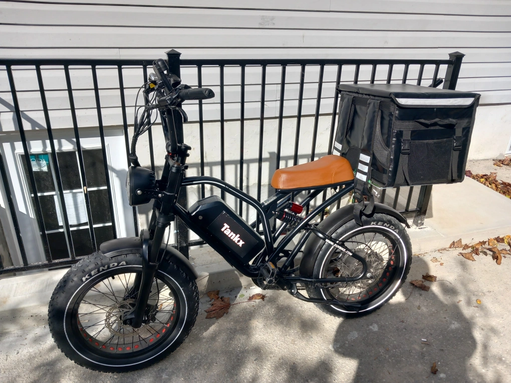 Electric bike with a large front basket and a rear seat. Has thick tires and appears to be in good condition. Comes with a Kenda tire.