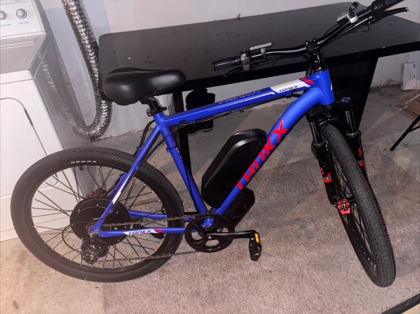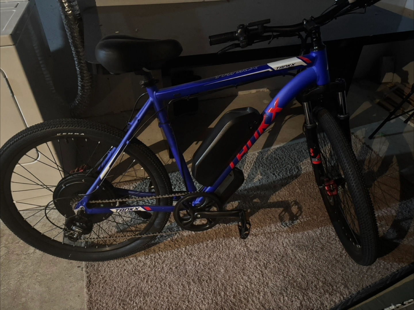 Selling a blue TANKX electric mountain bike! It's in great shape. Send offers, moving for school so i don’t need it anymore.
