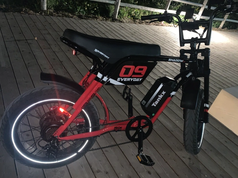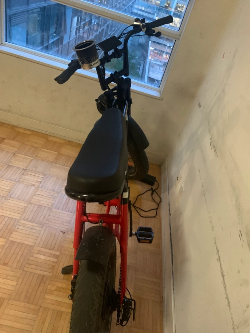 Red and black electric bike with a rear hub motor, fat tires and a black seat. Comes with a battery and a charger.battery has warranty with receipt. Fully equipped with an easy-to-ride alloy frame, 5 levels of electric pedal assist, front and rear hydraulic disc brakes, and 7-speed gears. The Shadow also boasts a 500-watt motor with a 48v 10.4Ah battery, bringing you both power and style in a lightweight frame.
