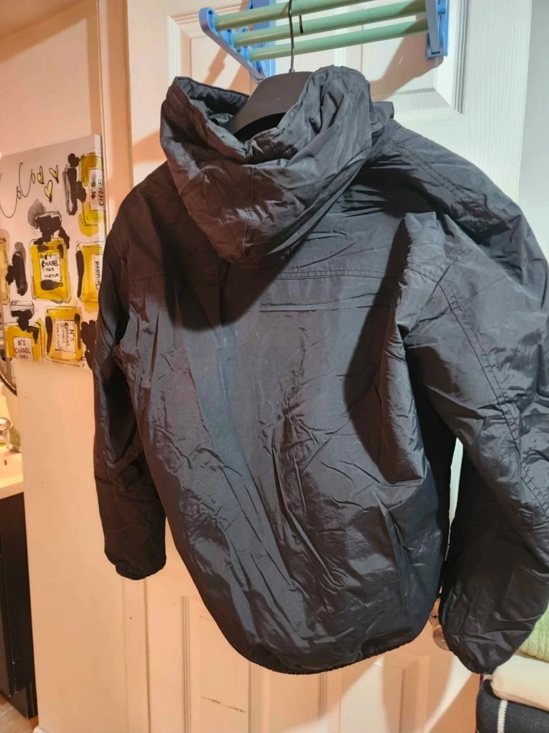 Snuggle up in style with this black Napapijri hooded jacket, perfect for those in-between weather days. It's in very good condition, ready for its next adventure!
