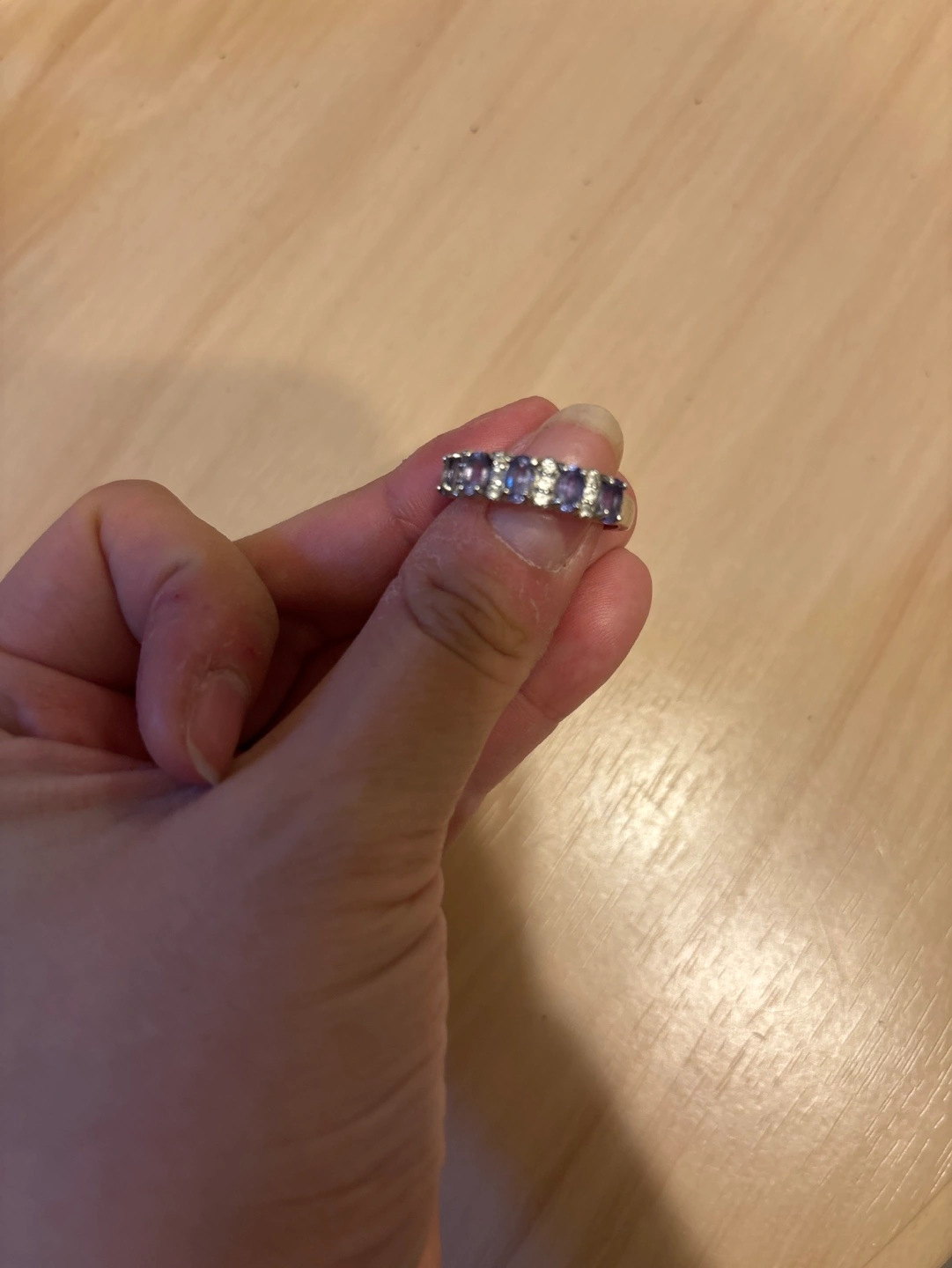 Silver band. Tanzanite stone. gemstones. Elegant and understated. Bought it in amazon but too big for me.