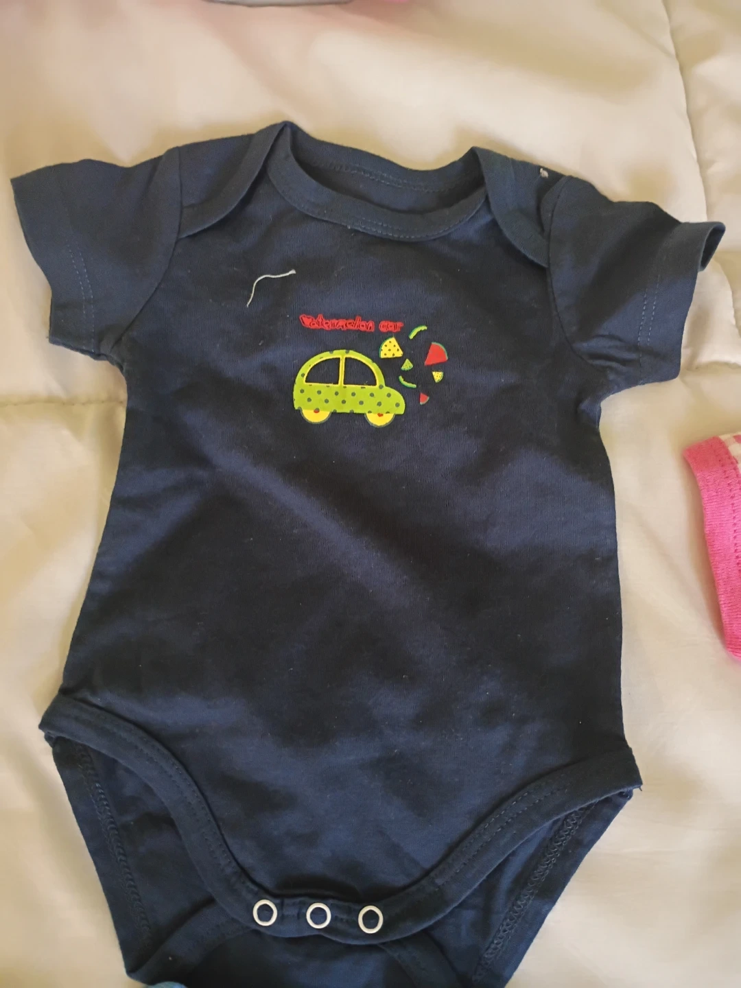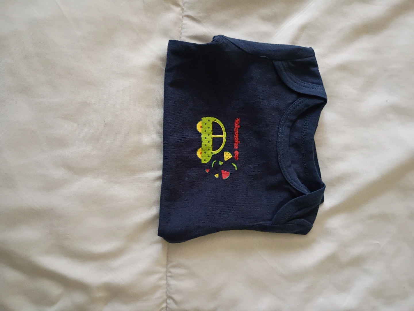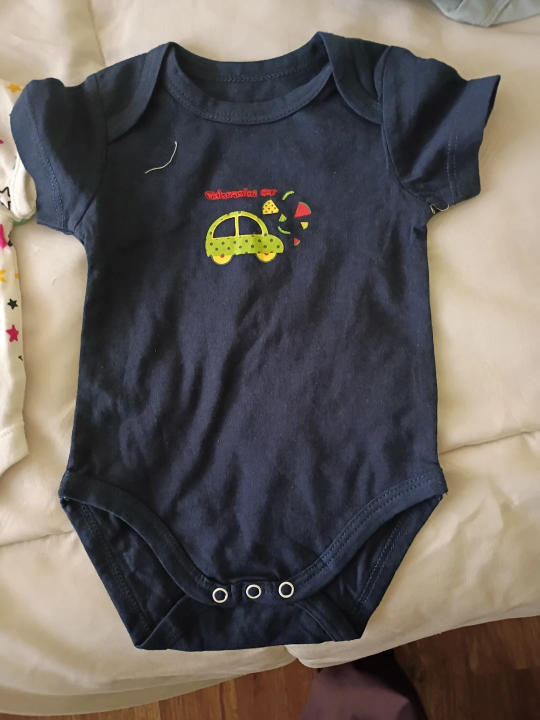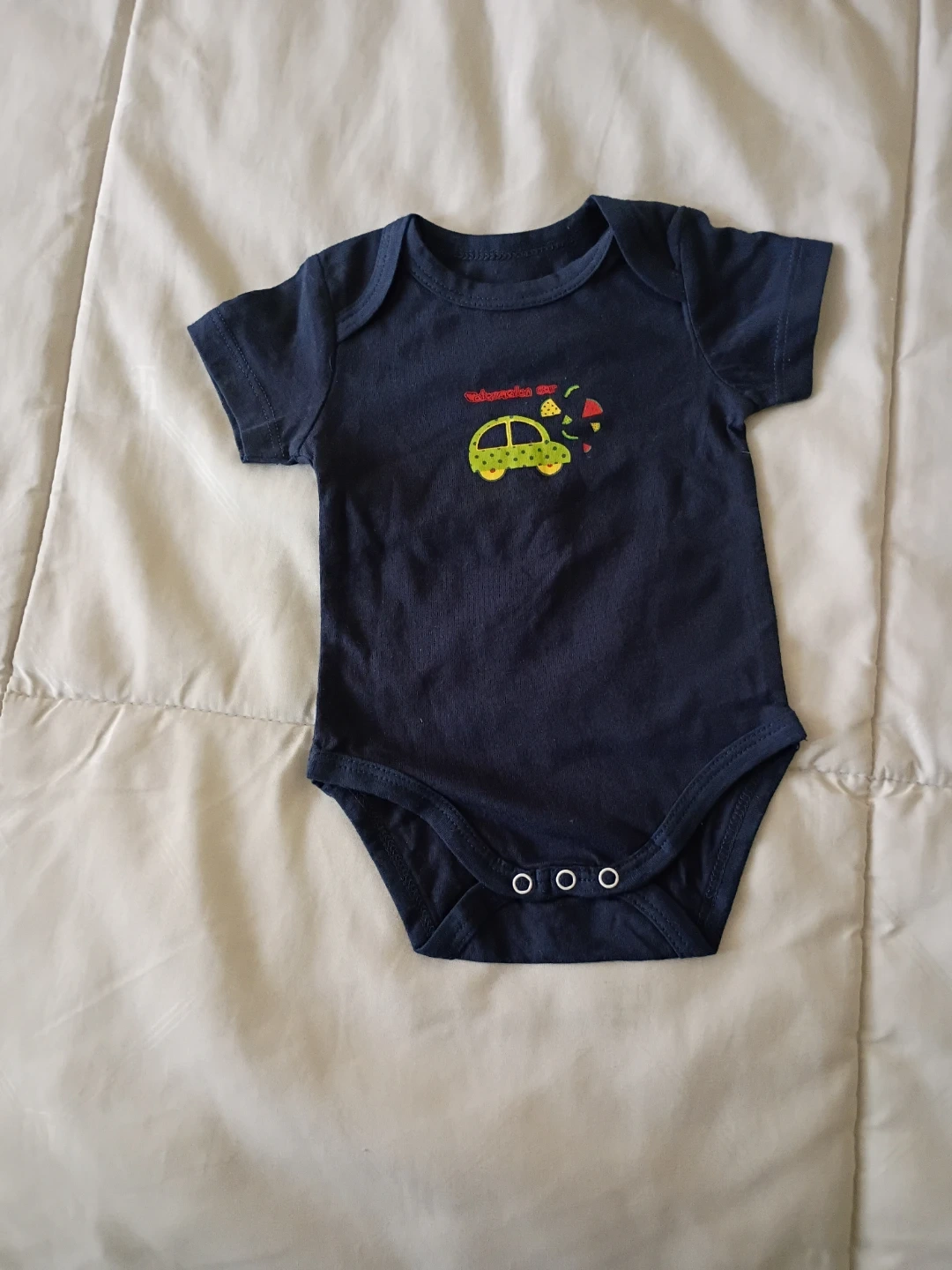 Navy blue short-sleeve bodysuit for babies. It features a cute "watermelon car" graphic on the front. Made from soft, breathable cotton. Three snap closures at the bottom for easy diaper changes.