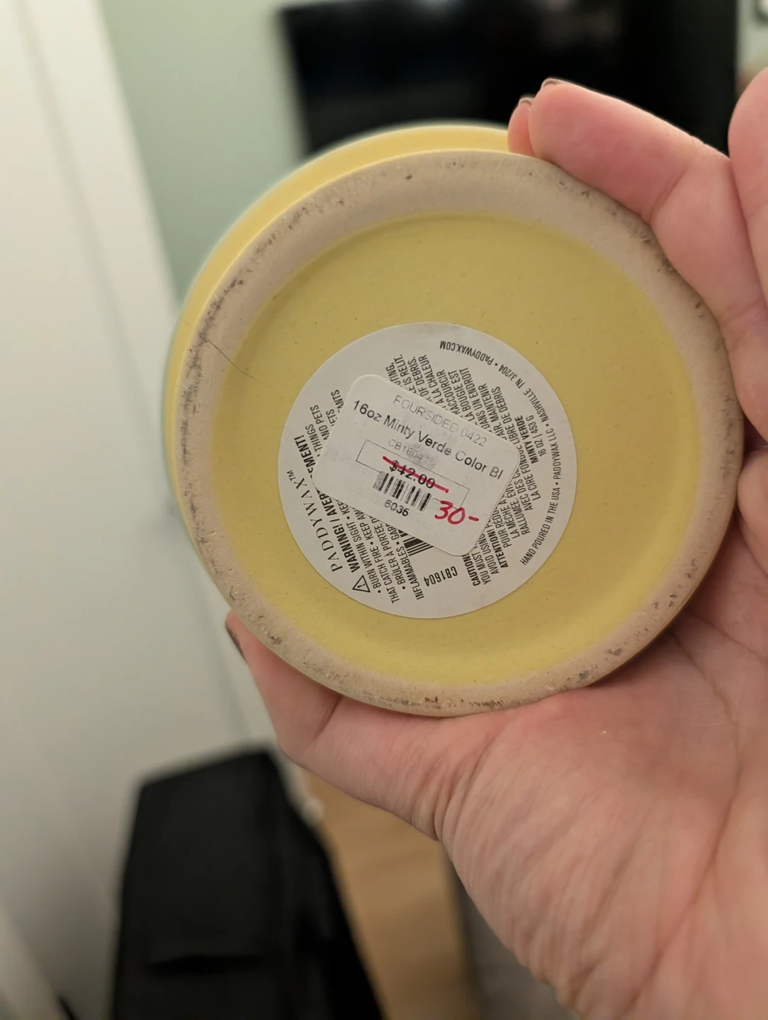 This is a 16oz Paddywax candle in a light blue and yellow ceramic container. The candle is labeled as 'Minty Verde Color BI' and has a price tag of $30.