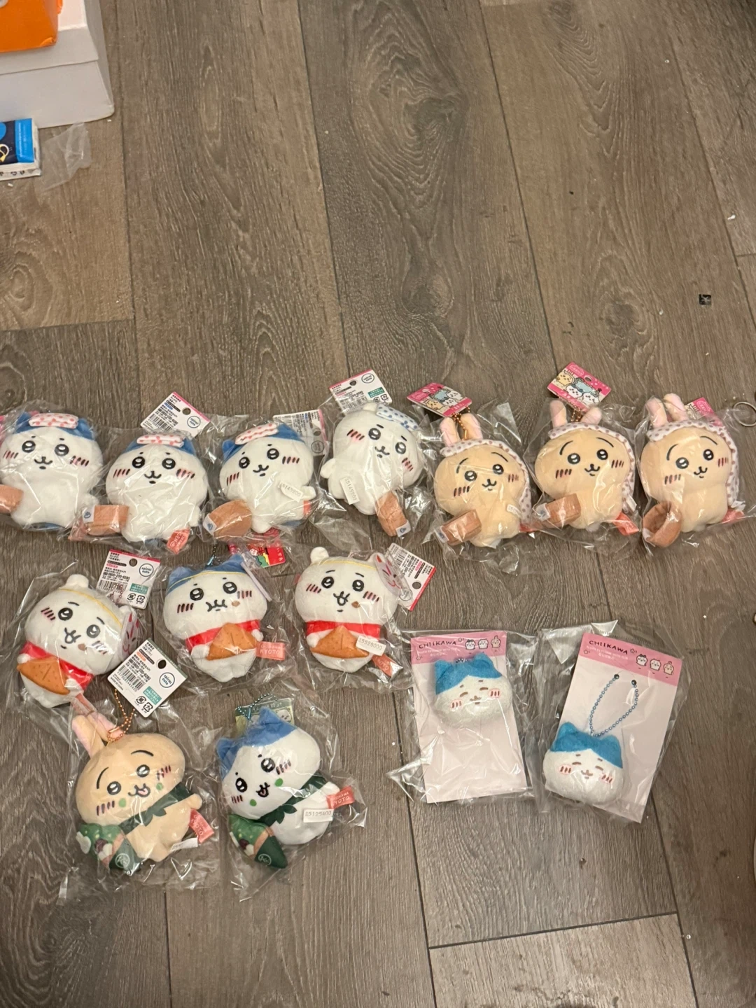 Collection of soft plush toys featuring various Chiikawa characters. Includes several keychains and smaller plushies, all in original packaging. These are great for fans of the popular manga and anime series.