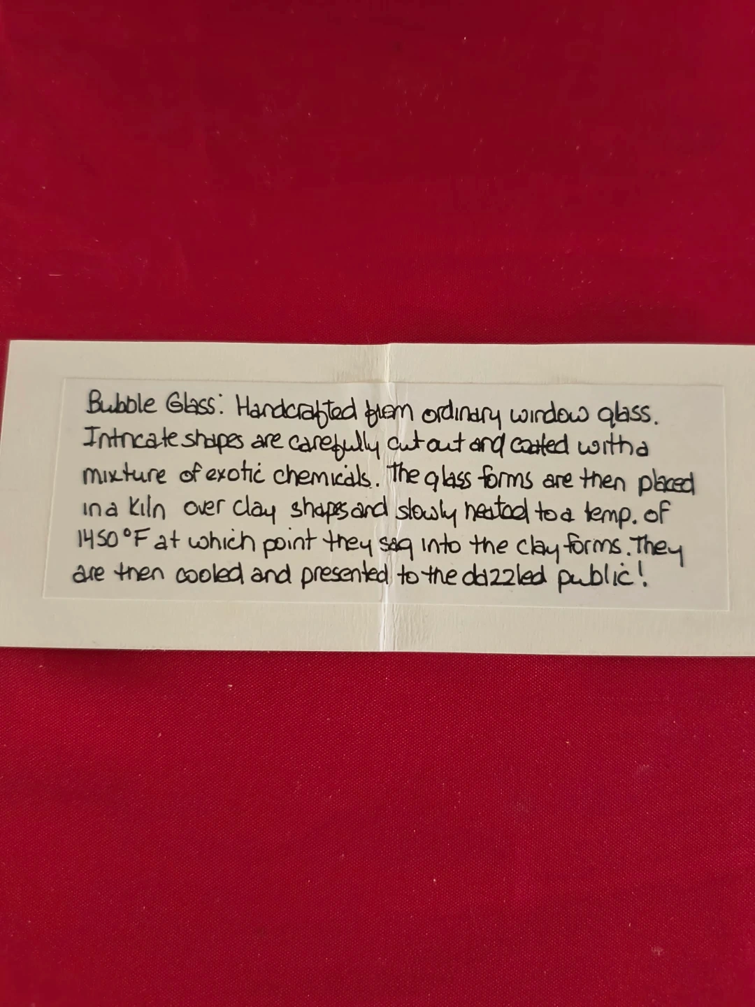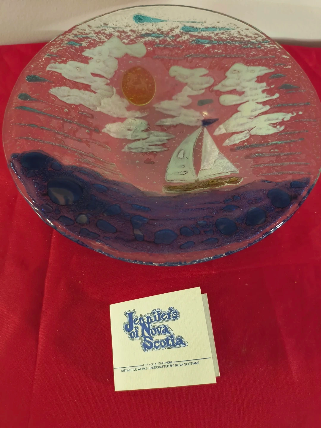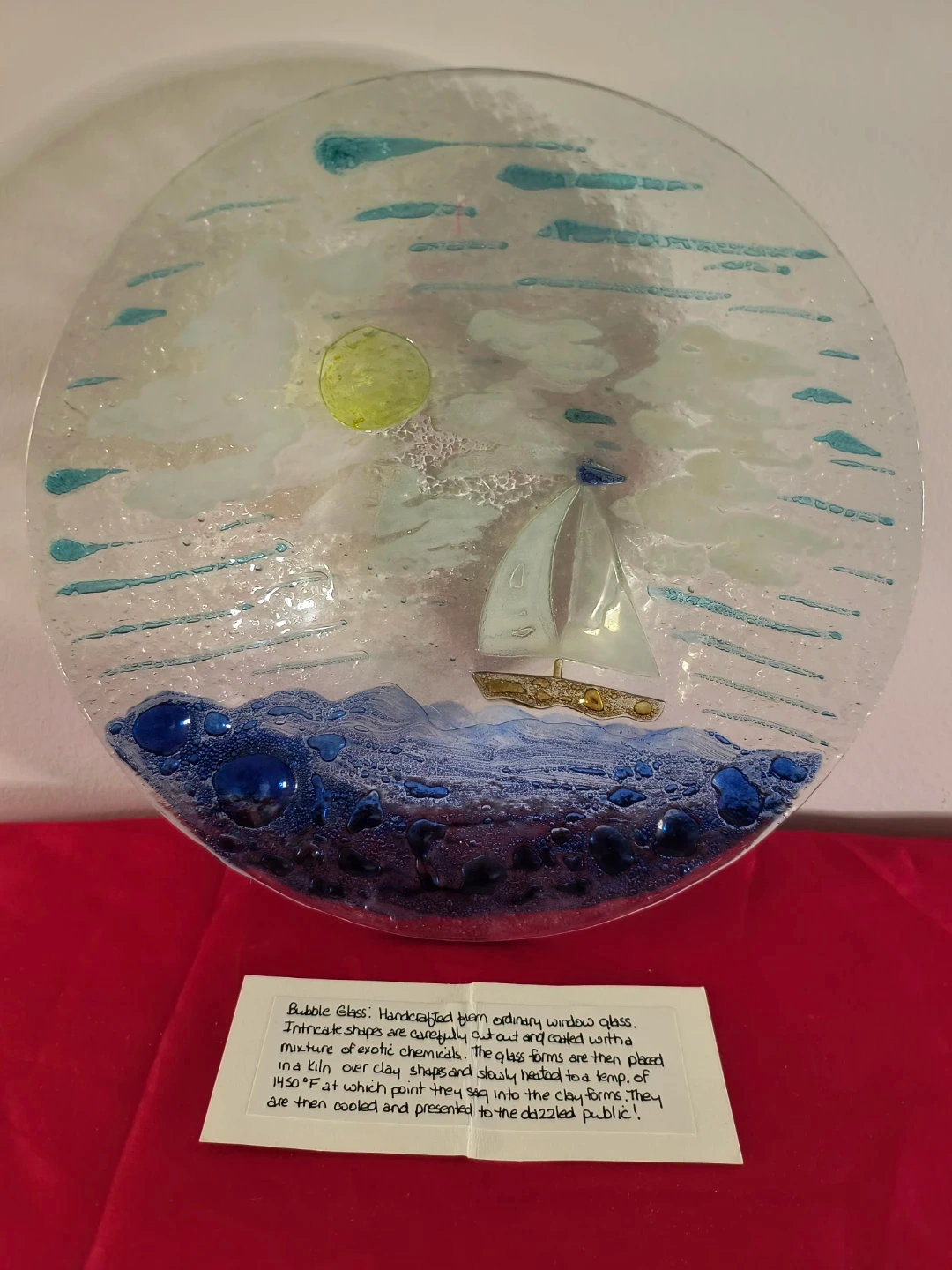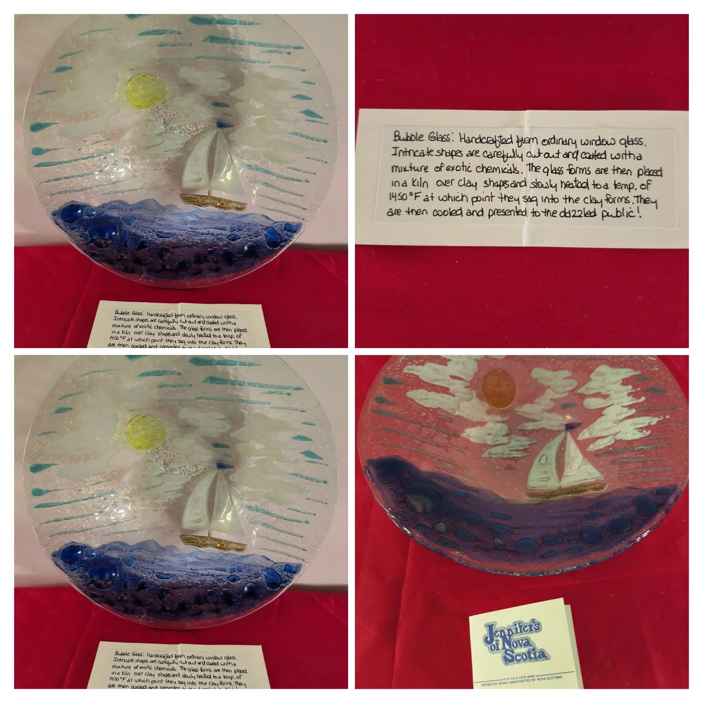 Handcrafted bubble glass dish featuring a sailboat scene. Made from ordinary window glass, it's intricately shaped and coated with exotic chemicals. The glass forms are fired in a kiln over clay shapes at 1450°F and cooled. It's a unique piece of decorative art.