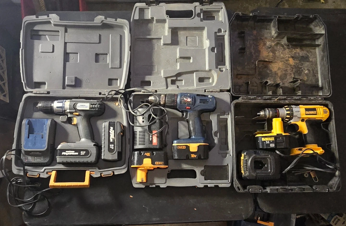 A large collection of assorted power drills, wrenches, sockets, screwdrivers, and pliers. Includes DeWalt, Craftsman, and other brands. Great for any home or professional workshop!