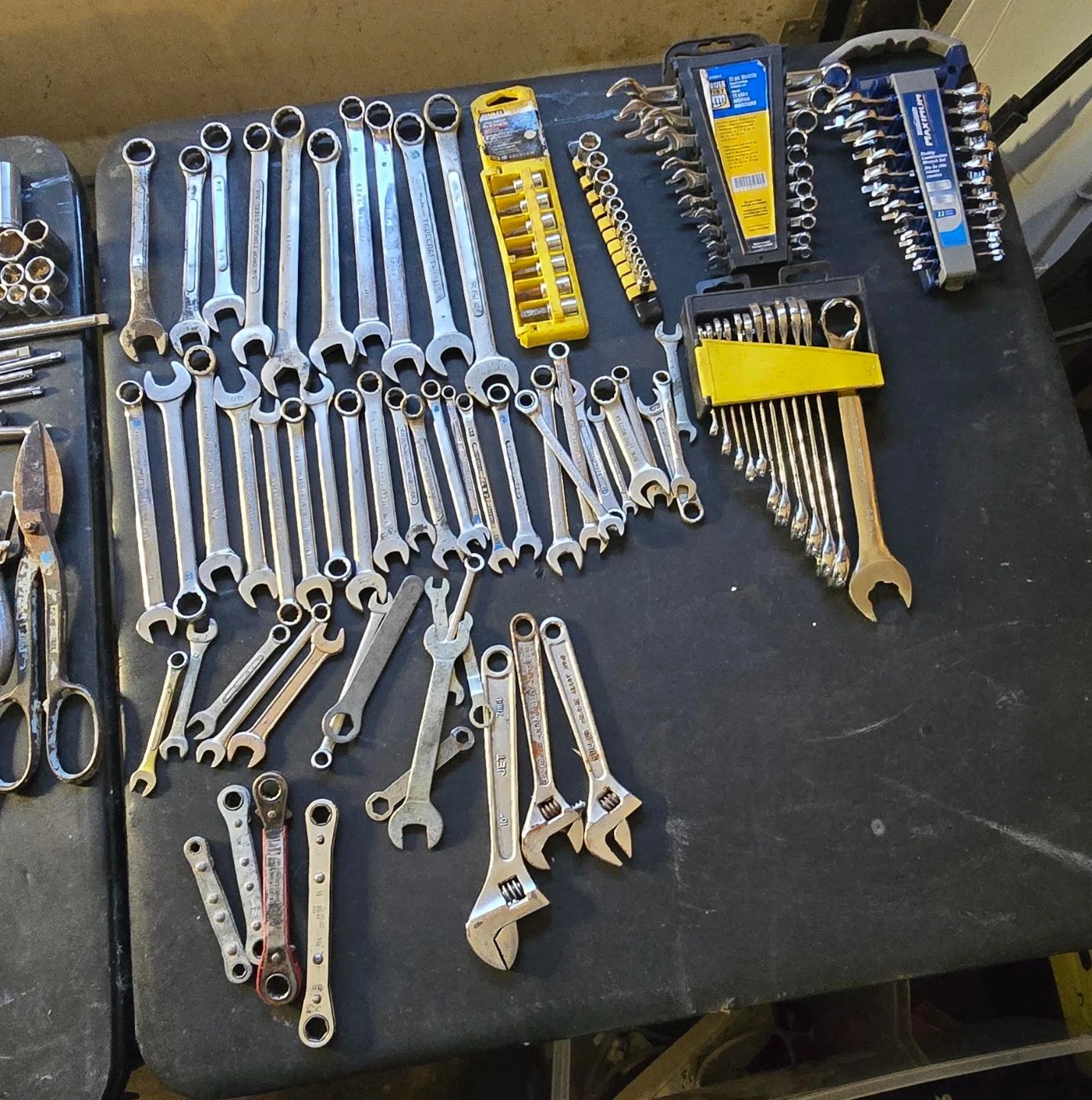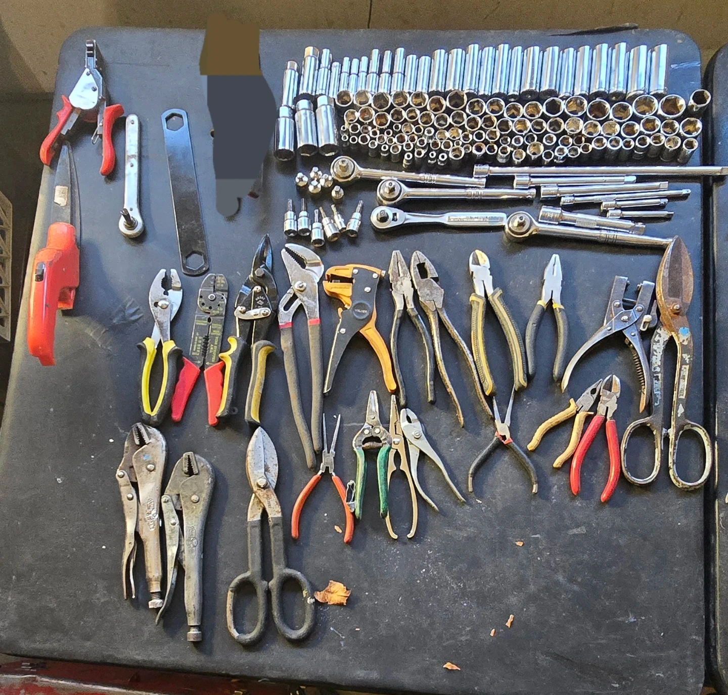 A large collection of assorted power drills, wrenches, sockets, screwdrivers, and pliers. Includes DeWalt, Craftsman, and other brands. Great for any home or professional workshop!