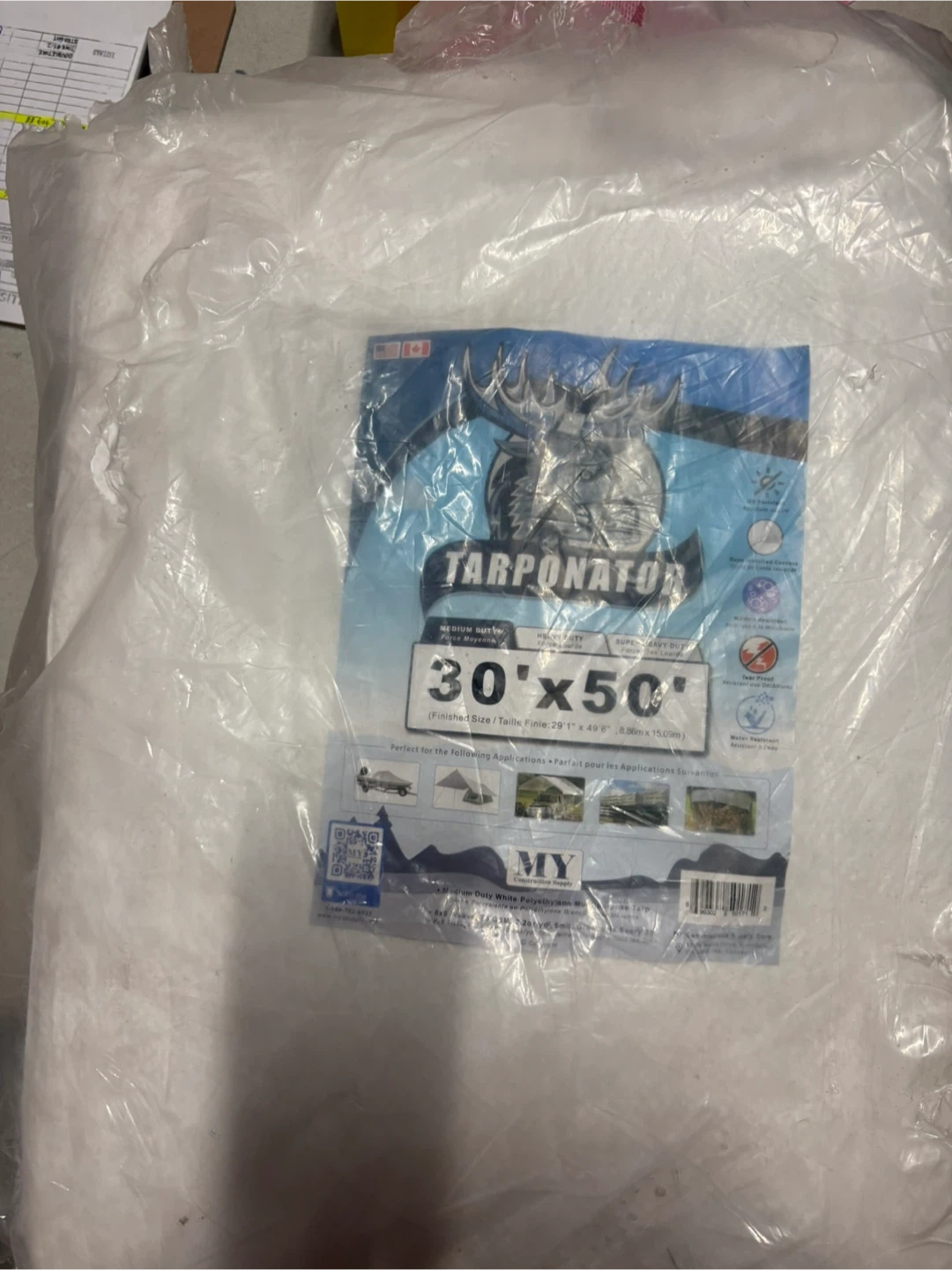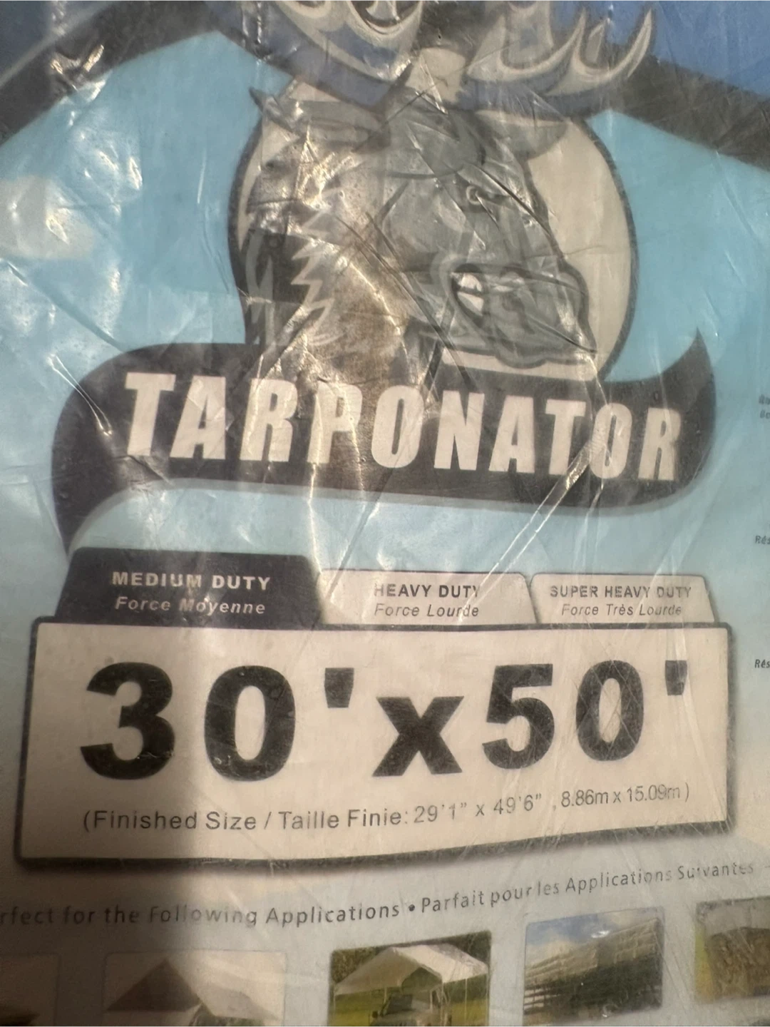 9Selling a Tarponator tarp, medium duty. It's sized at 30' x 50', with a finished size of 29'1" x 49'6" (8.86m x 15.09m). Perfect for various applications!