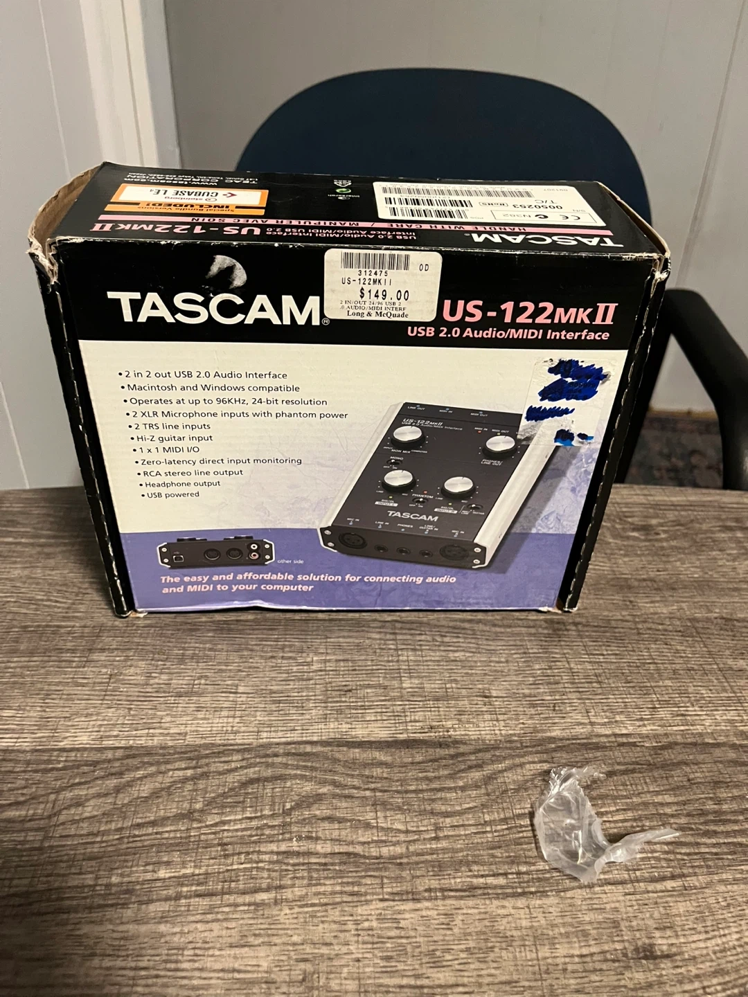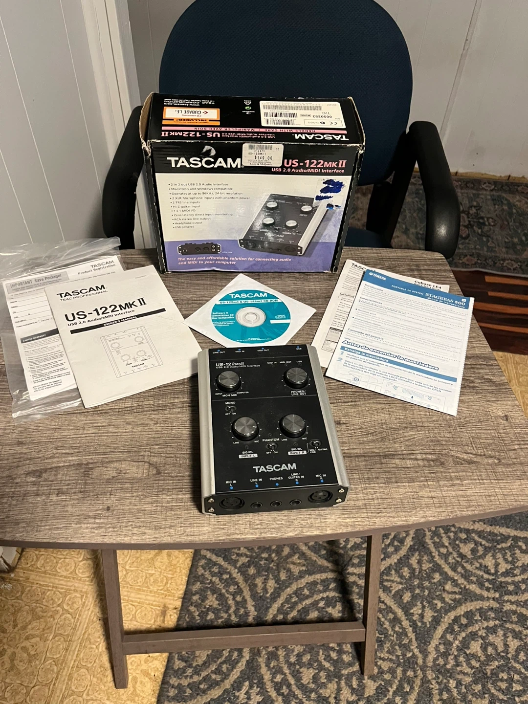 60Selling a Tascam US-122MKII USB 2.0 Audio/MIDI Interface. It's the easy and affordable solution for connecting audio and MIDI to your computer! Key features: - 2 in 2 out USB 2.0 Audio Interface - Compatible with Mac and Windows - Operates at up to 96kHz, 24-bit resolution - 2 TRS line inputs - Hi-Z guitar input - MIDI I/O - Zero-latency direct input monitoring - Headphone output - USB powered Box included! Originally bought for $149