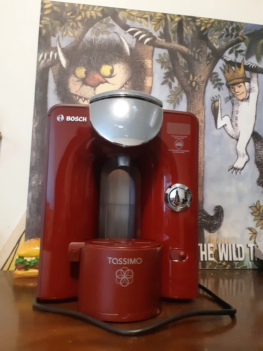 230Tassimo T55 multi-beverage system coffee maker with instructions in burgundy red colour for sale for $75 or best offer! Good condition! 7786083054 call or text! Greyhound Station/Main St. pick-up is best! Model: TAS55xxUC