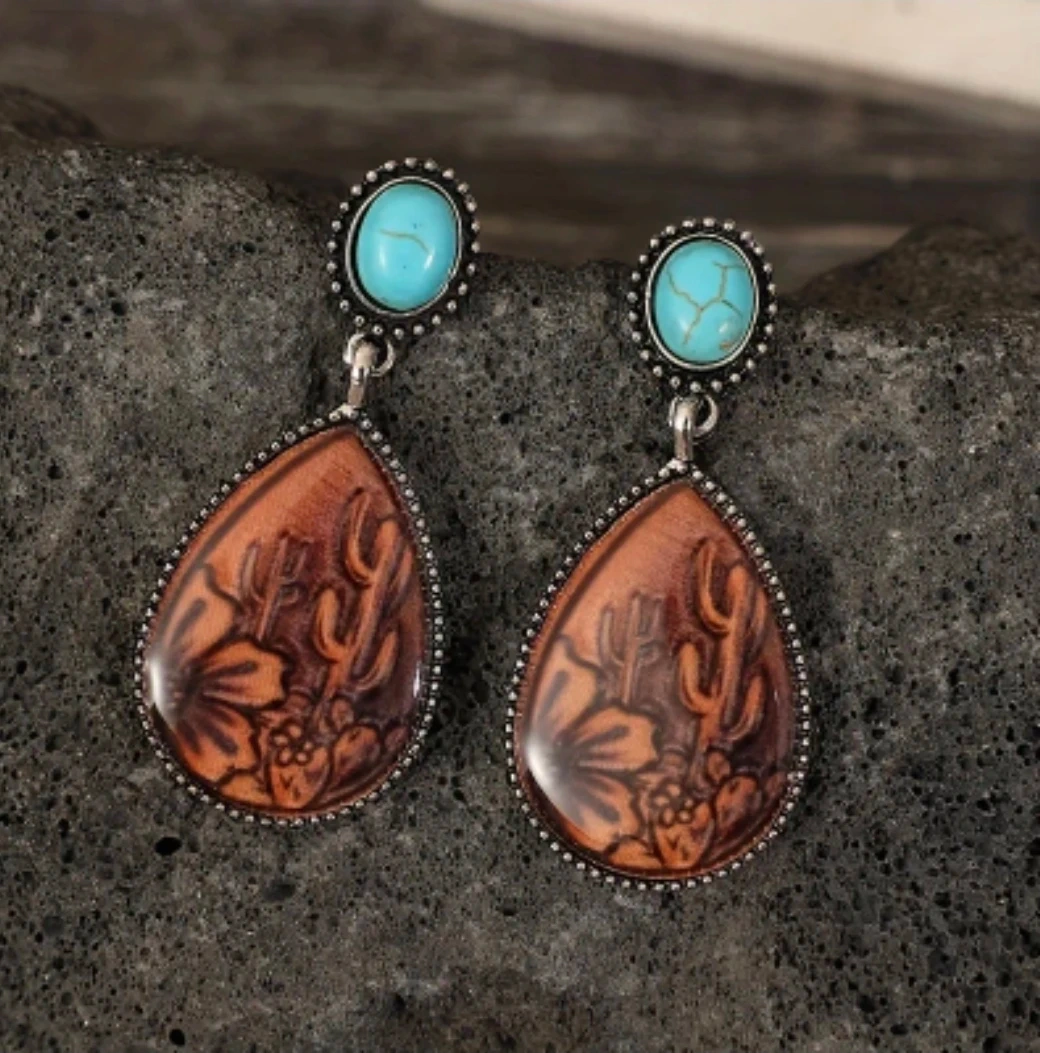 NEW Western Turquoise & Embossed Cactus Teardrop Earrings