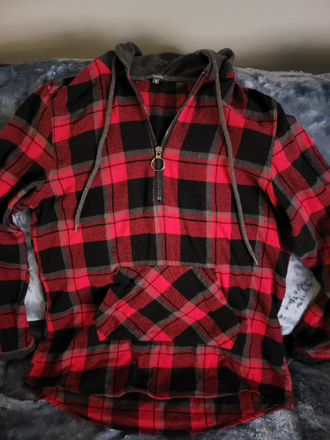 Cozy up in this stylish Tattoo flannel hoodie! It features a classic red and black plaid pattern, a comfortable hood, and a convenient front pocket. Perfect for layering on chilly days. Size small