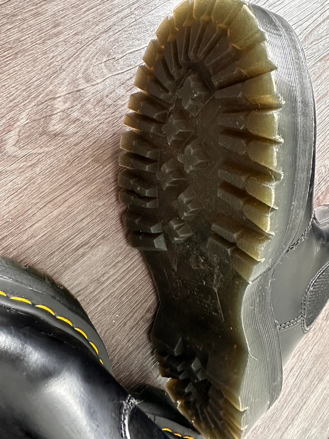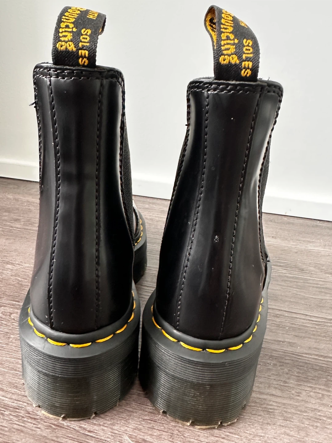 These are black leather Dr. Martens platform Chelsea boots. They're a US L size 6.Built with a durable platform sole and signature yellow stitching. These boots are ready for everyday wear!