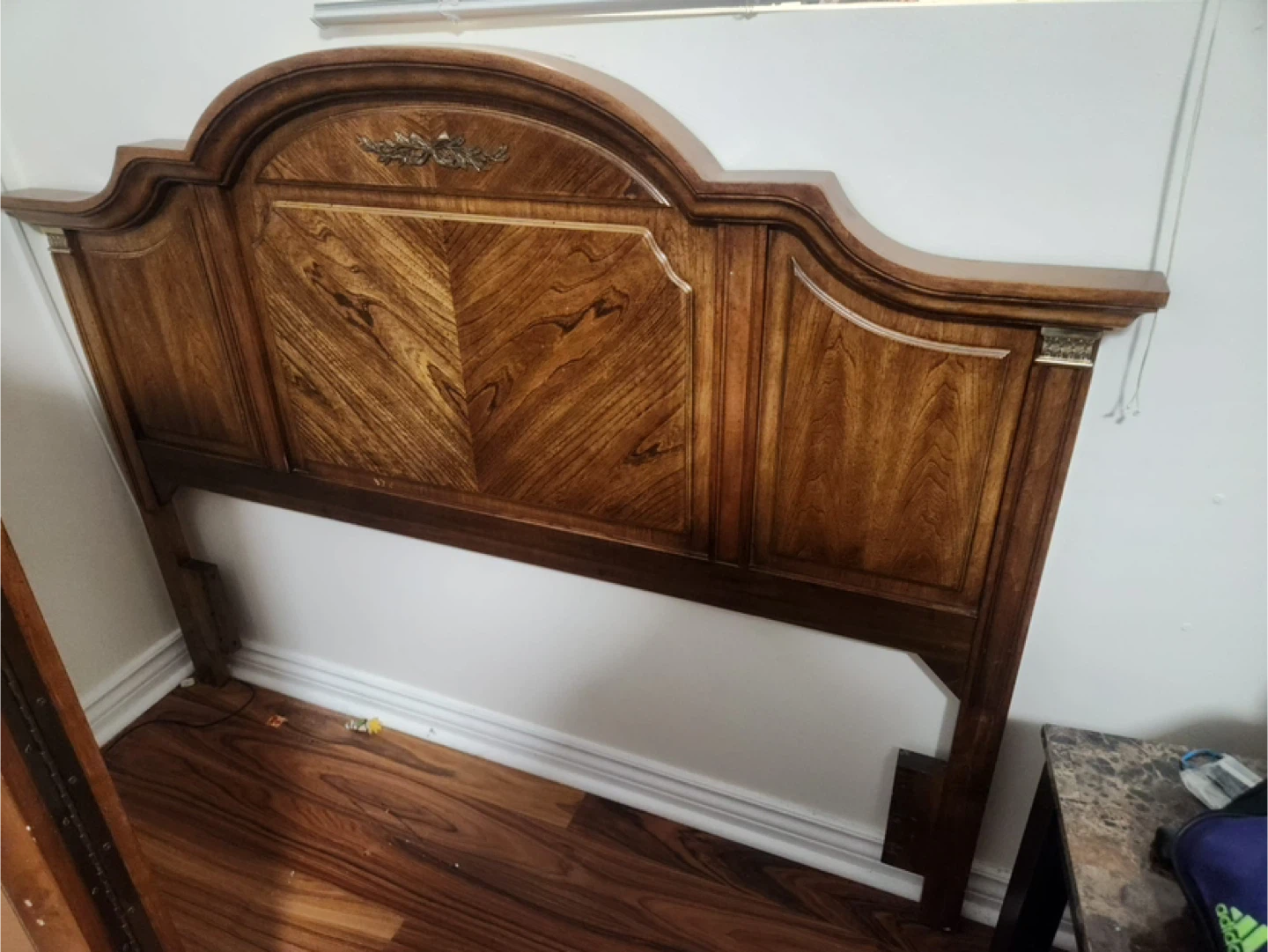Selling a lovely vintage wooden headboard. Made with solid wood so a bit heavy. t's in good condition and would add a touch of elegance to any bedroom. Perfect for a full or queen size bed