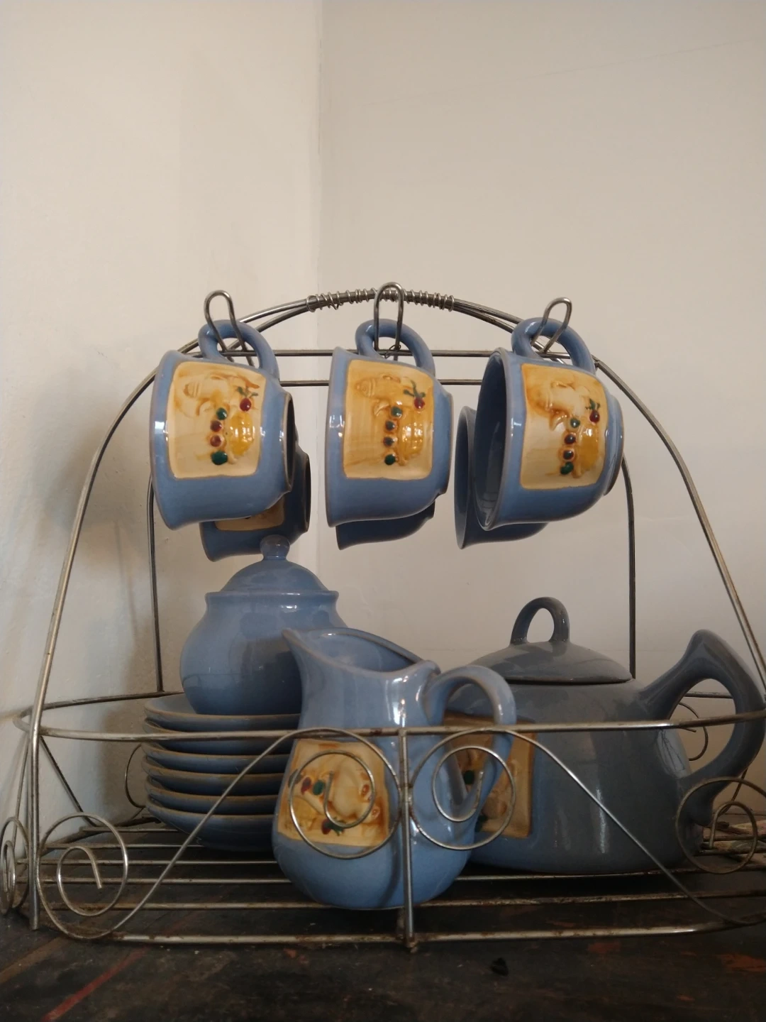 This charming tea set includes a teapot, sugar bowl, creamer, four cups, and saucers. It's made of durable ceramic with a lovely blue glaze and decorative floral accents. Perfect for serving tea during a casual gathering!