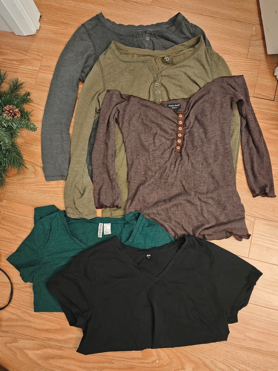 Includes 5 tops: a long-sleeve grey marled top, a long-sleeve olive green henley, a long-sleeve ribbed brown top, and a short-sleeve black v-neck tee. The green tee is by H&M, and the brown top has a 'Guess Jeans' tag. These are great casual tops for everyday wear.