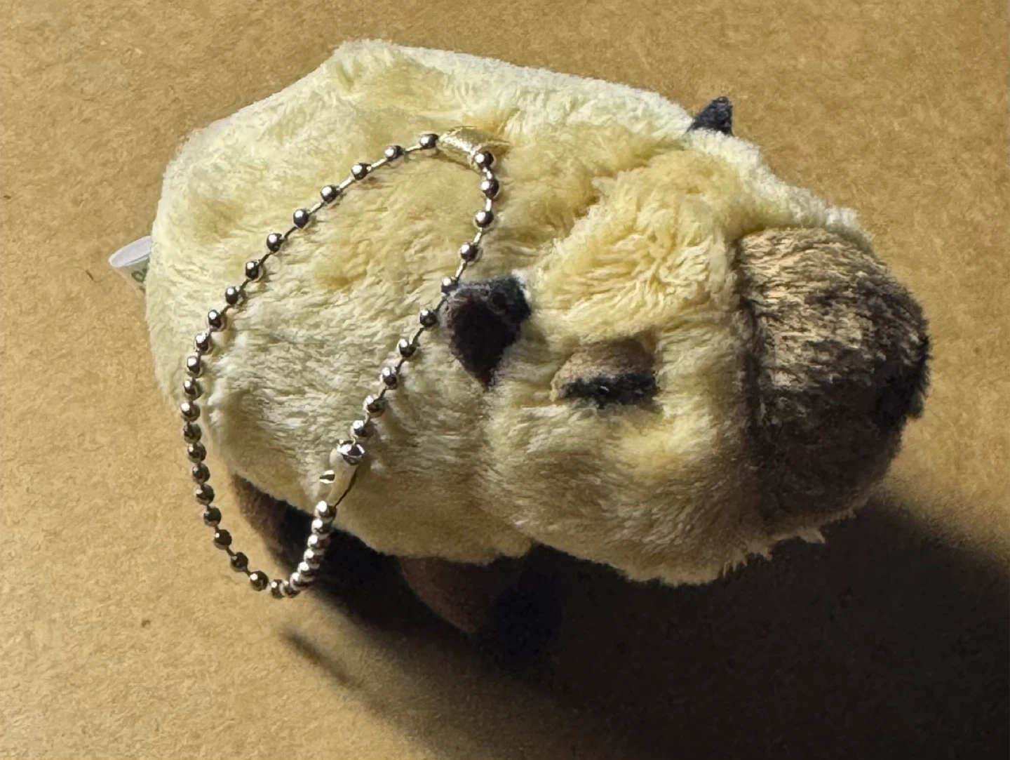 A fluffy capybara plush with a silver bead keychain. It's made of soft material. Perfect for attaching to your backpack or keys!