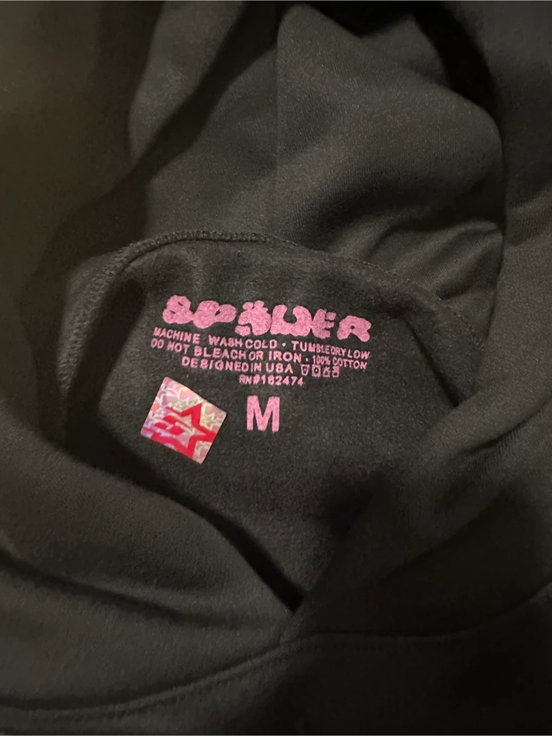 This black Spider hoodie features a "pink! heres the slime" graphic with spiderwebs and stars. It's made of 100% cotton and designed in the USA. Size medium.
