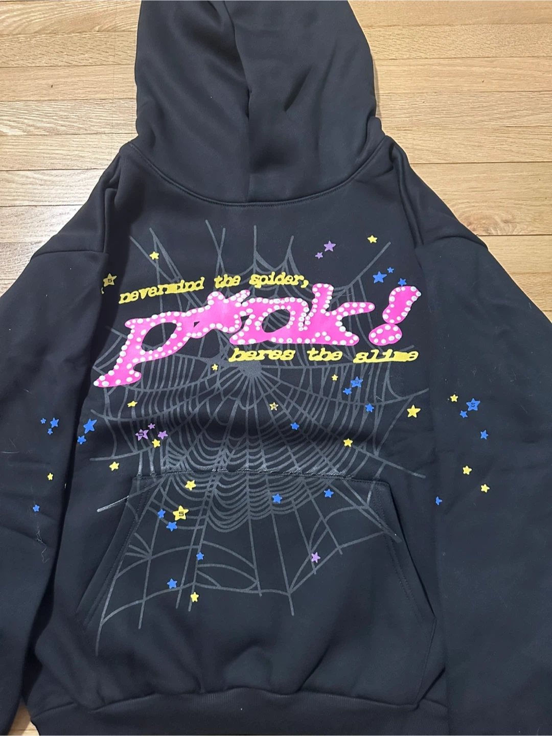 This black Spider hoodie features a "pink! heres the slime" graphic with spiderwebs and stars. It's made of 100% cotton and designed in the USA. Size medium.